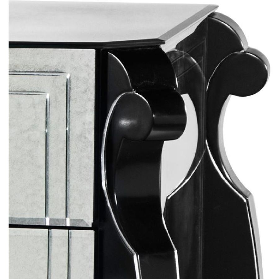 Structure made of matt black lacquered wood with details in silver leaf. Covered in curved medium antiqued mirror hand engraved.