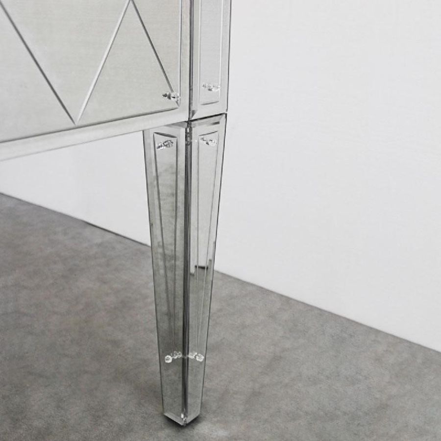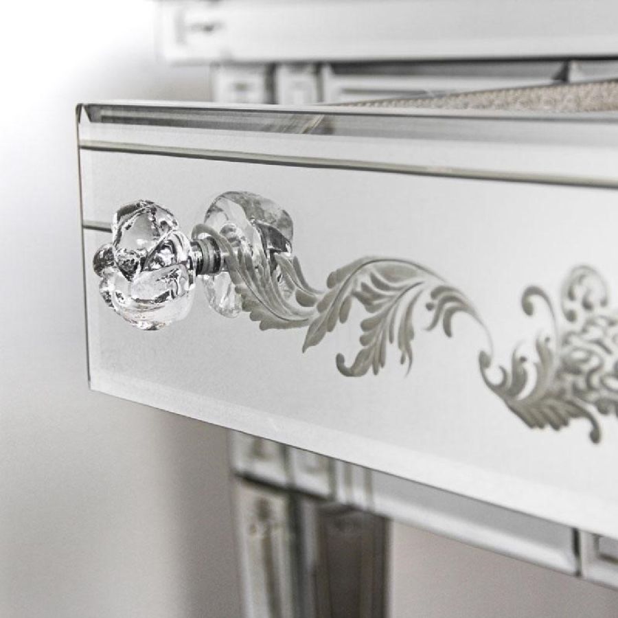 Front, sides and legs made of bevelled and engraved glass with medium antique mirrored finish. Three partially extractable drawers with soft-close system. Beige velvet on the inside. Rosette-shaped glass knob with chrome-plated brass.