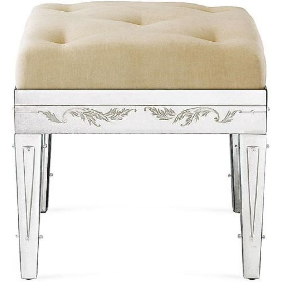 Stool with four tapered legs, upholstered with beige velvet and decorated with five buttons.