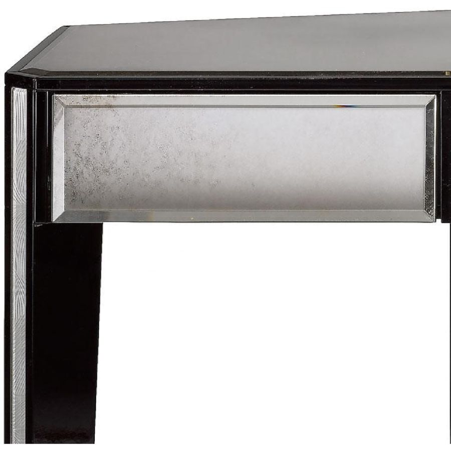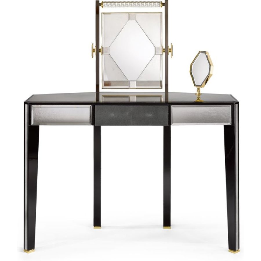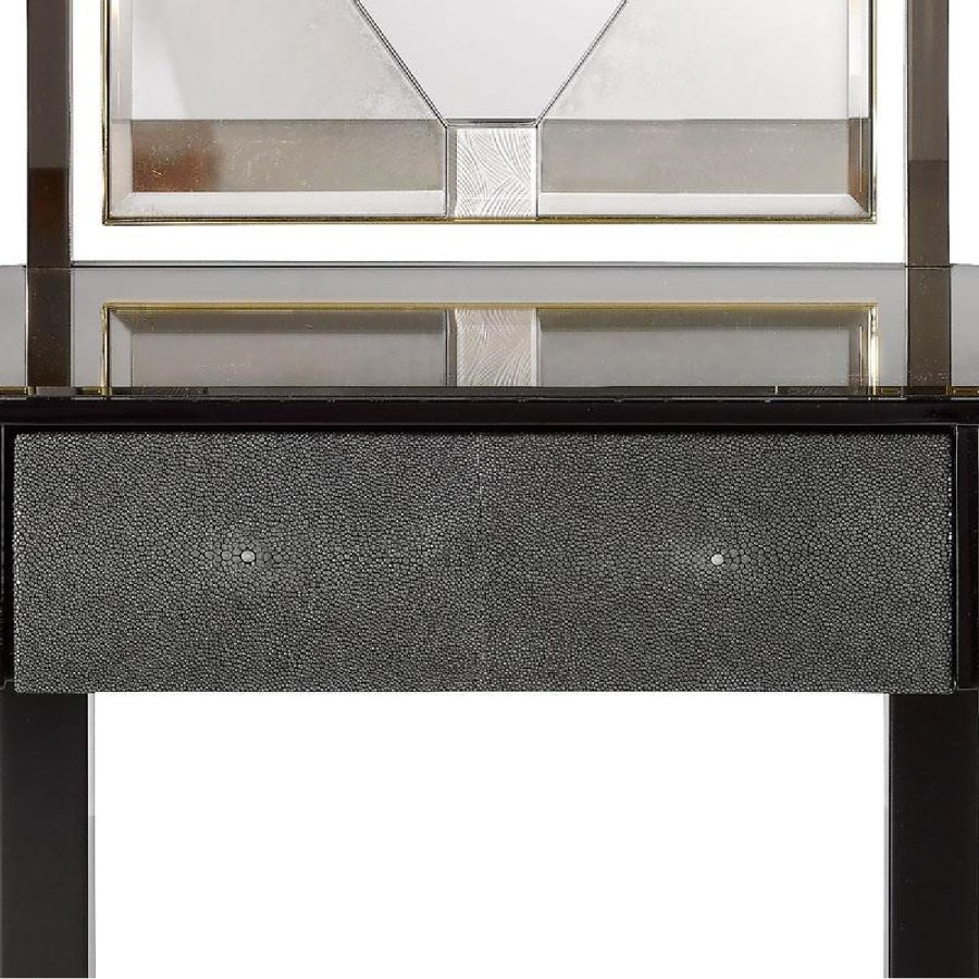Central drawer with ray-fish leather on the front. Two side bevelled glass drawers with medium antique mirrored finish on the front.