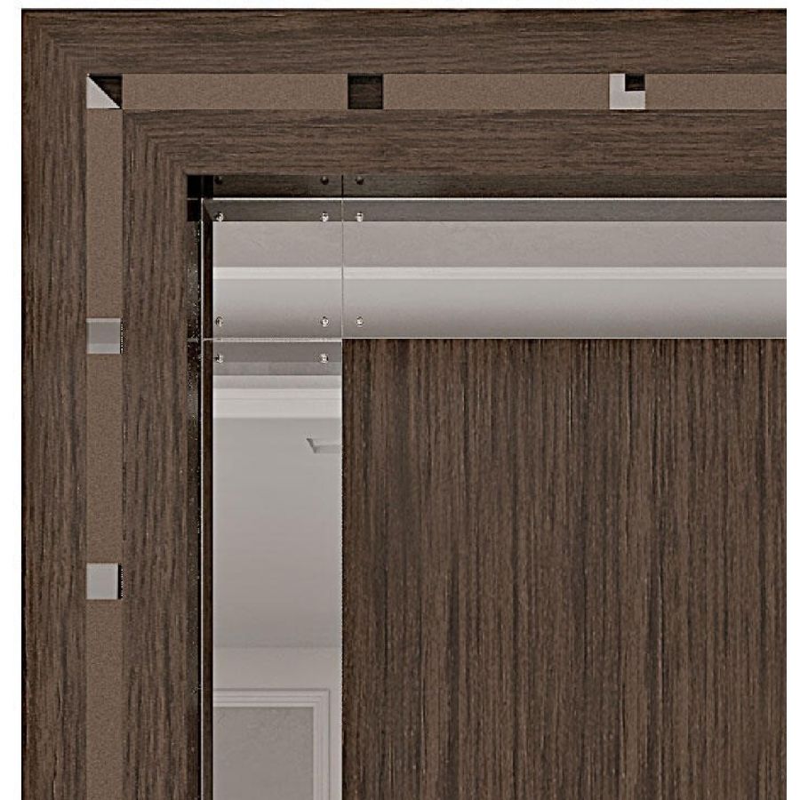 Outer frame made of bronze glass tiles with clear mirrored finish and brass stripes with bronze finish.