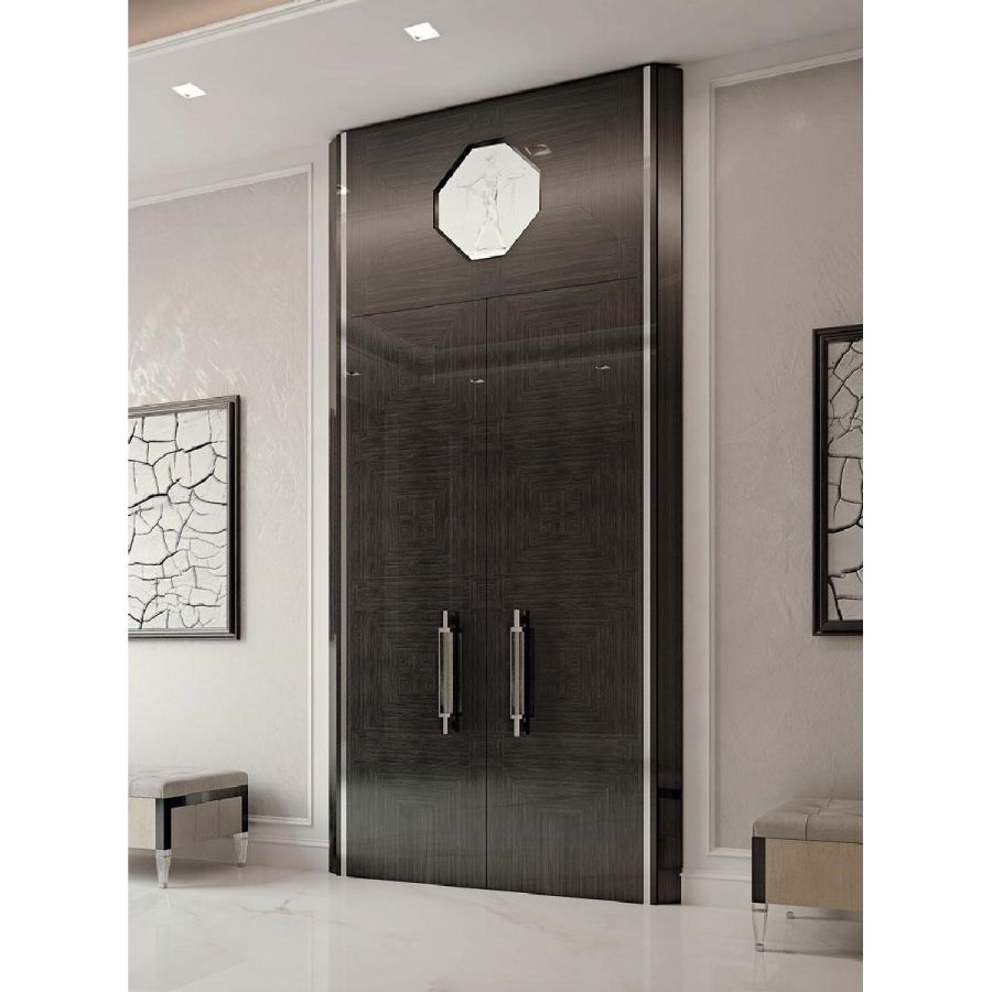 Octagonal medallion, above the door, made of bevelled and engraved glass with clear mirrored finish.