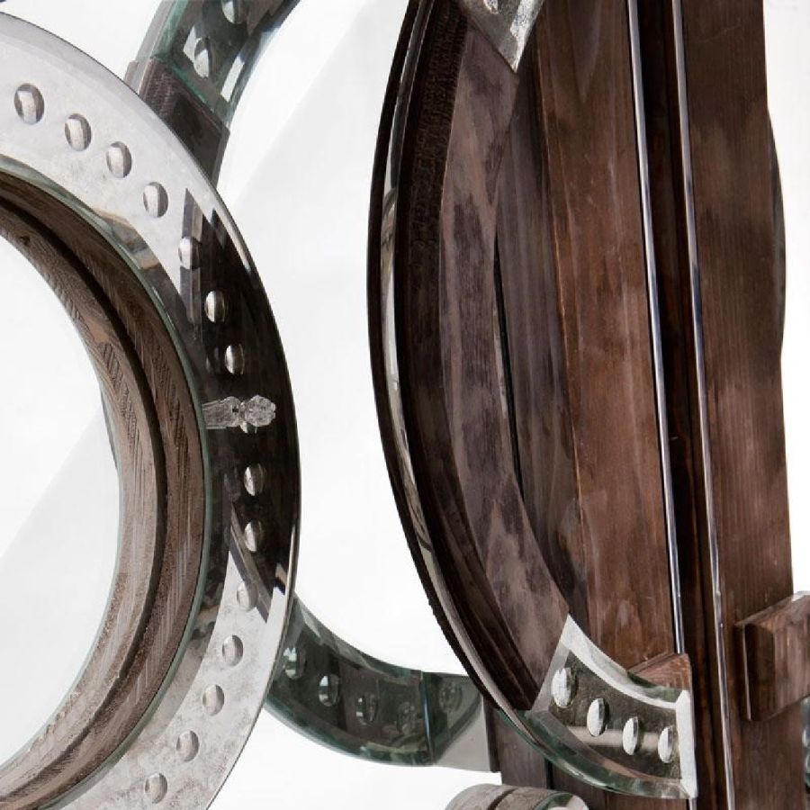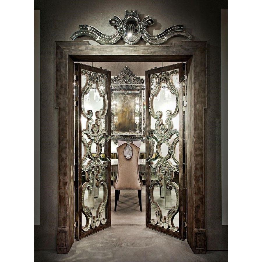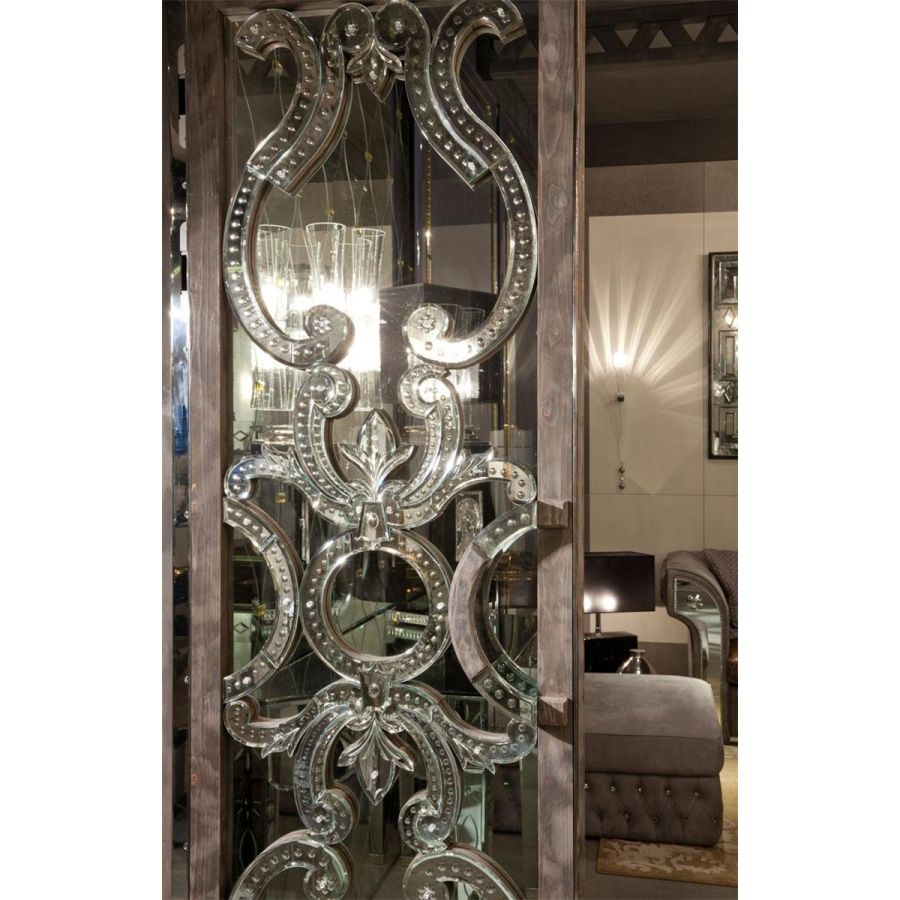 Decors of the doors, crest and handle made of bevelled and engraved glass with medium antique mirrored finish.