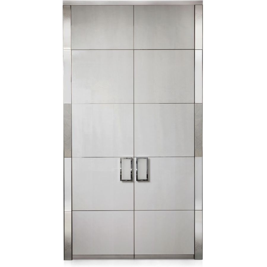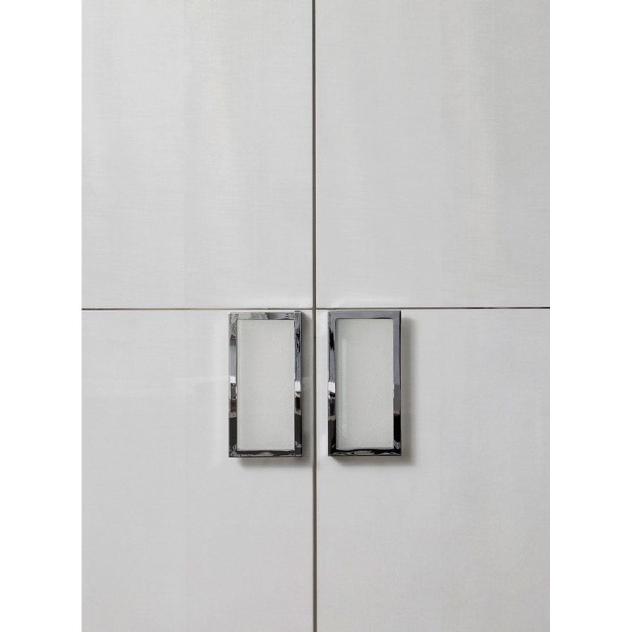 Battuto decor engravings on the central tiles of each jamb. Two handles made of shiny chrome-plated brass and Battuto decor engraved glass.