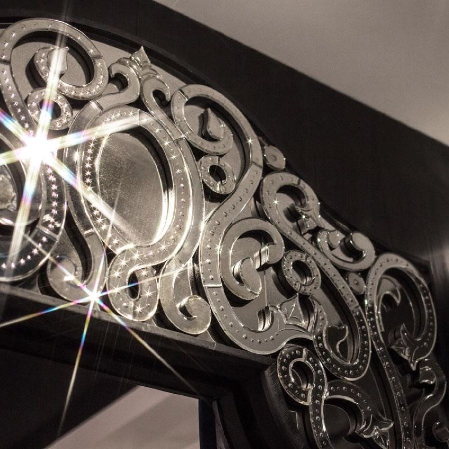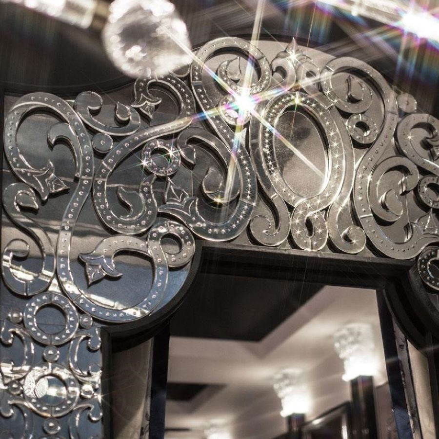 Jambs and crest made of bevelled and engraved glass with light antique mirrored finish.
