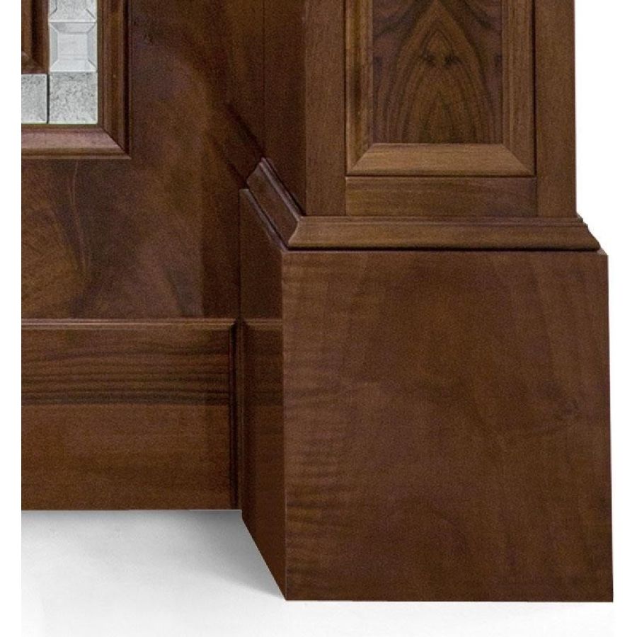Structure made of wood with shiny walnut finish. Two wooden doors with crest made of bevelled glass with medium antique mirrored finish. Low relief frames made of wood and engraved glass tiles.