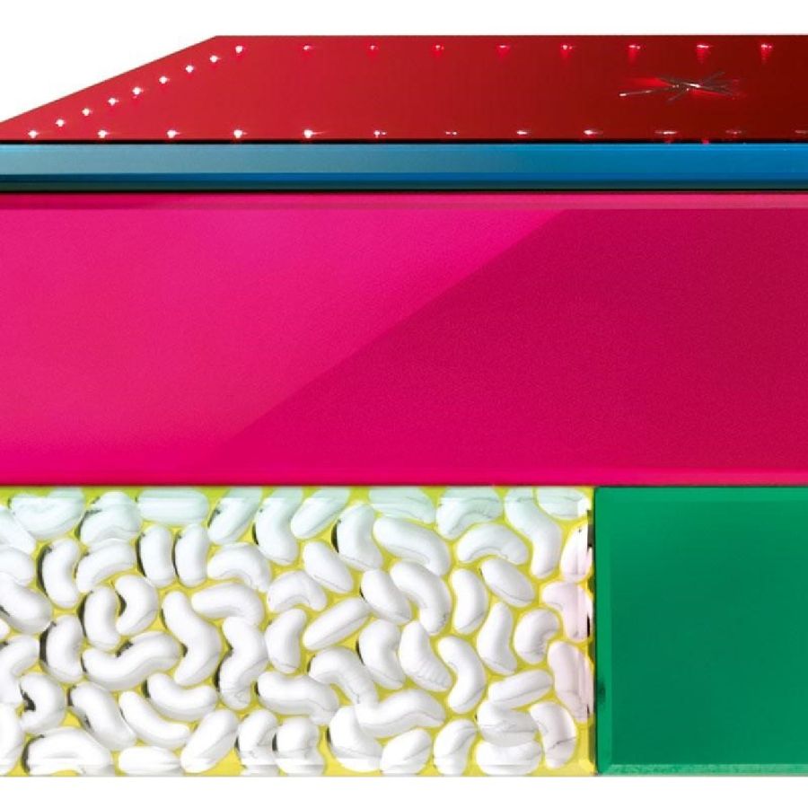One drawer with push-pull opening. Inside made of wood with white matte lacquered finish. Top, drawer, sides and back made of coloured and laquered glass.