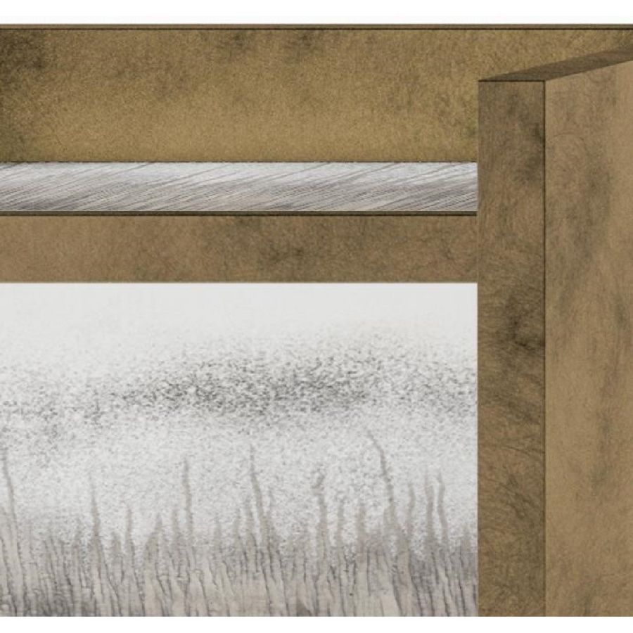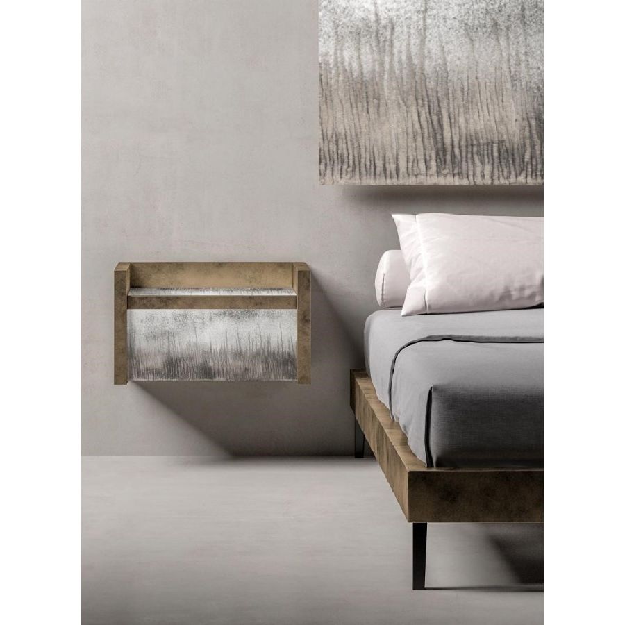 Suspended bedside table with push and pull opening, MDF veneered plywood structure. Wood structure finished in antique brass varnish, 6 mm thick extra-clear acid-etched glass with polished edge finish with diamond grinding wheel engraving on the etched side.