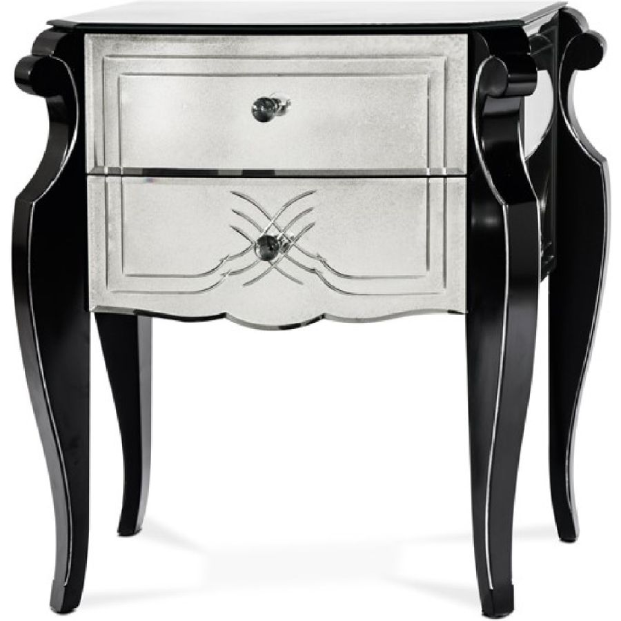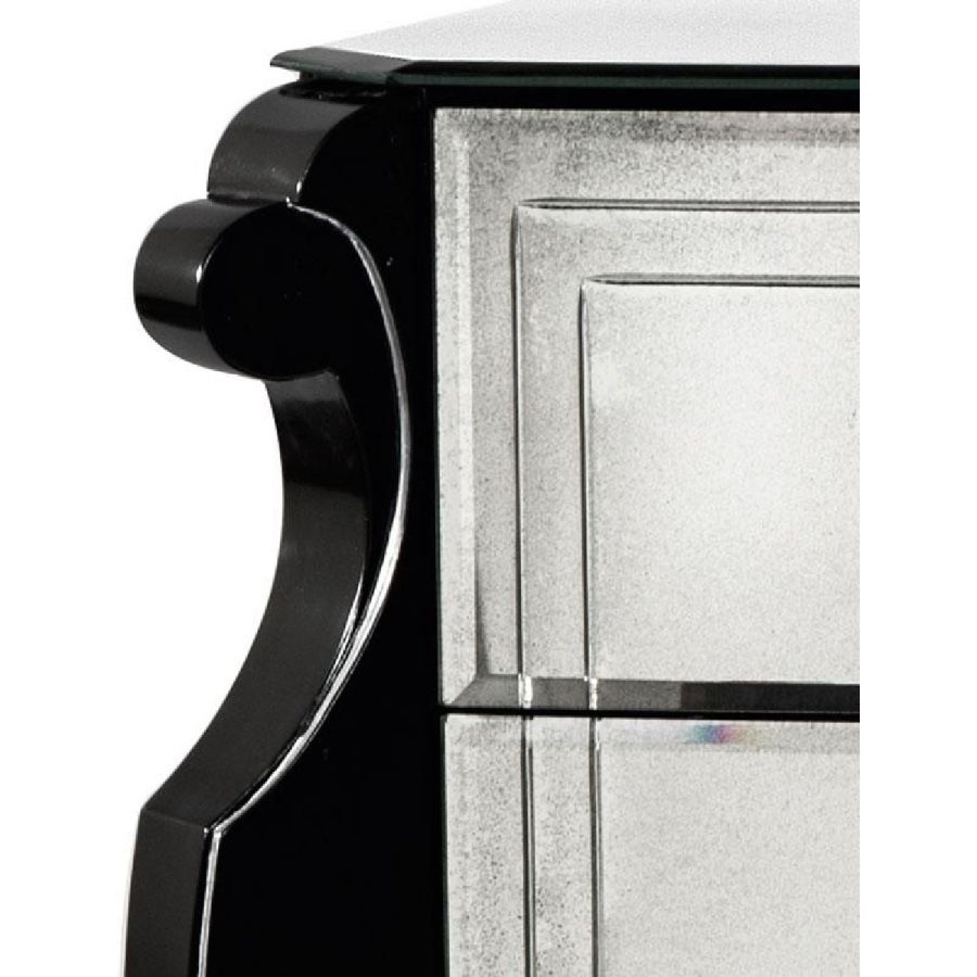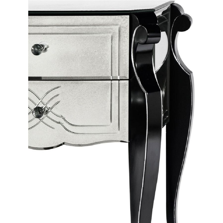 Two partially extractable drawers, with soft-close system and with black matte lacquered finish on the inside. Top, sides and back made of bevelled glass with medium antique mirrored finish.