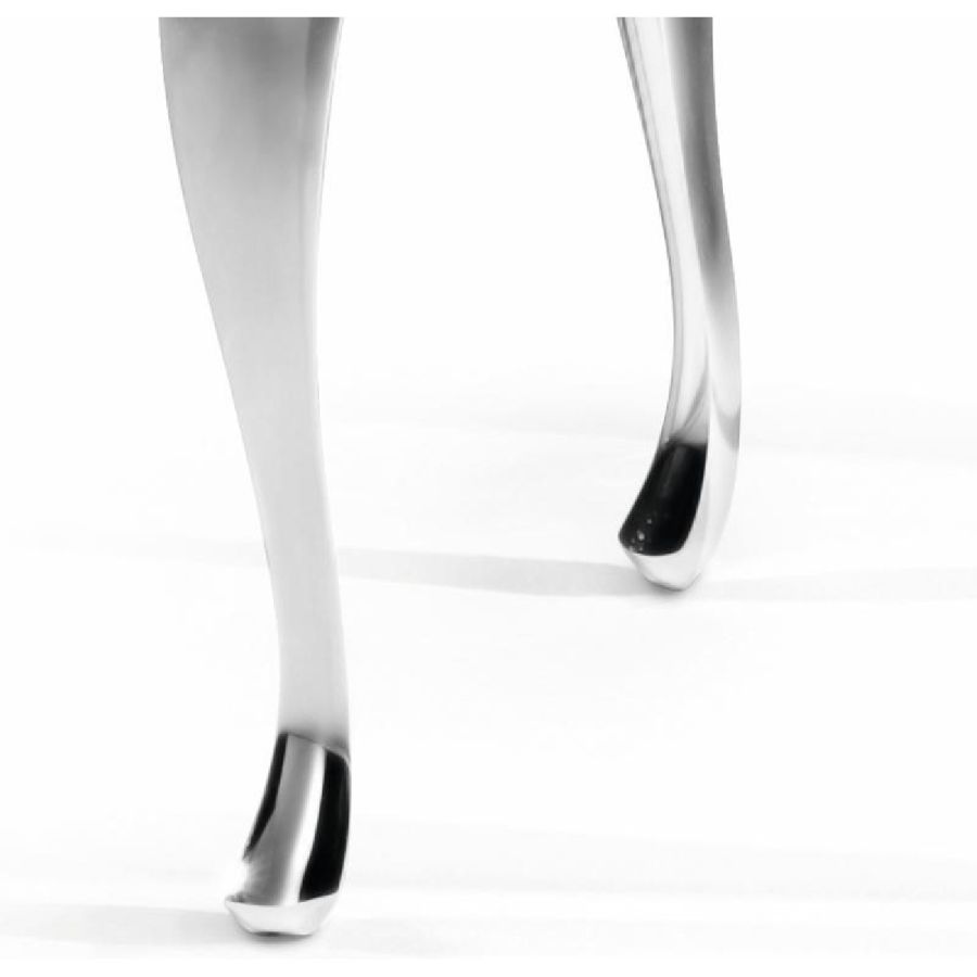 Structure made of wood with white matte lacquered finish. Four shaped legs made of cast glass aluminium with chrome-plated finish. One drawer with push-pull opening.