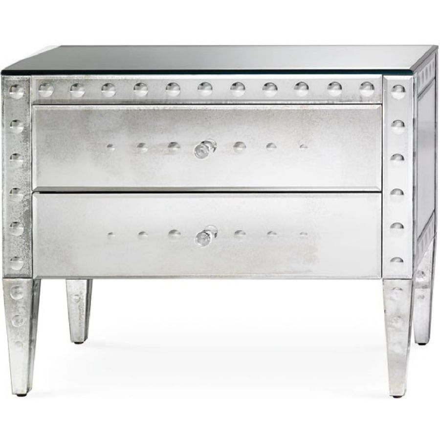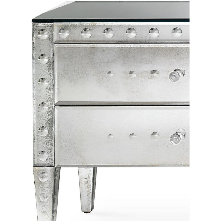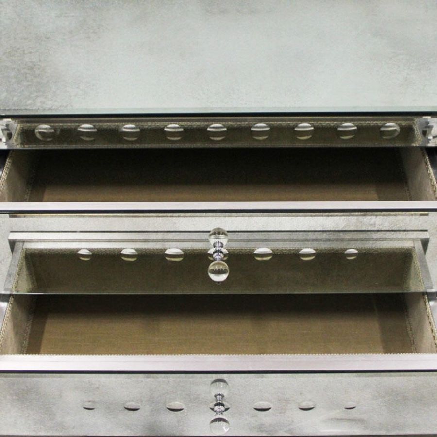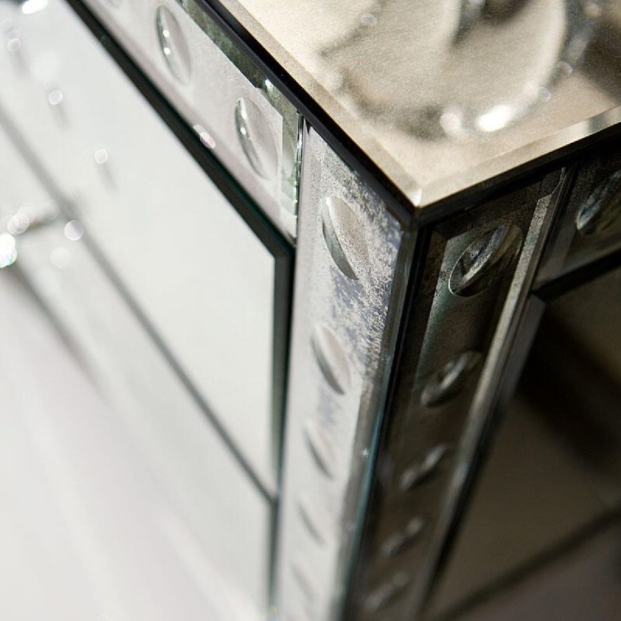 Two partially extractable drawers, with soft-close system and with beige velvet on the inside. Top, sides and back made of bevelled glass with medium antique mirrored finish.