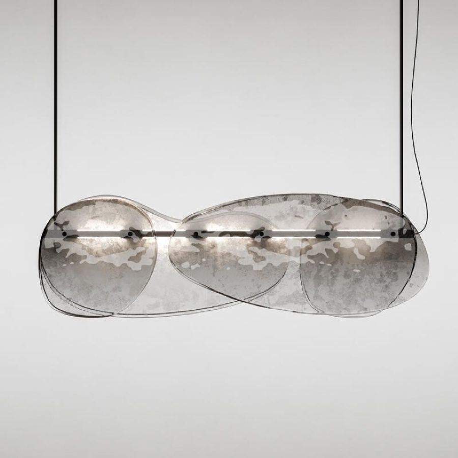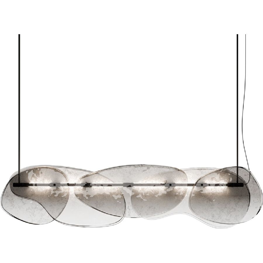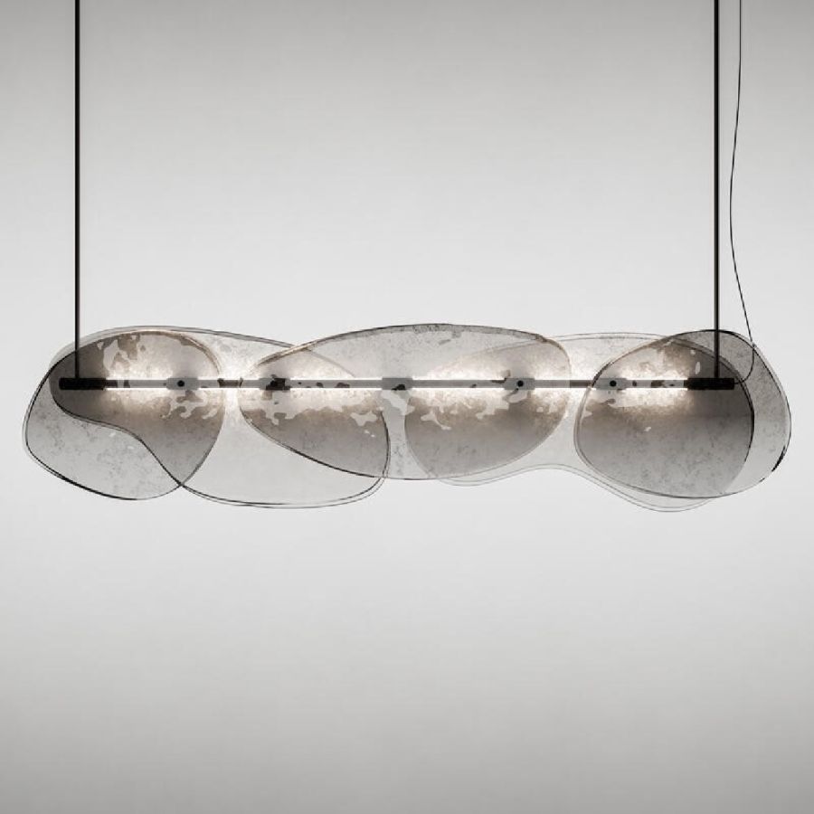 Chandelier with decorative elements in baked glass in two layers with irregular edges. All decorated in degradé from lead grey to transparent with partial silvering on the back.