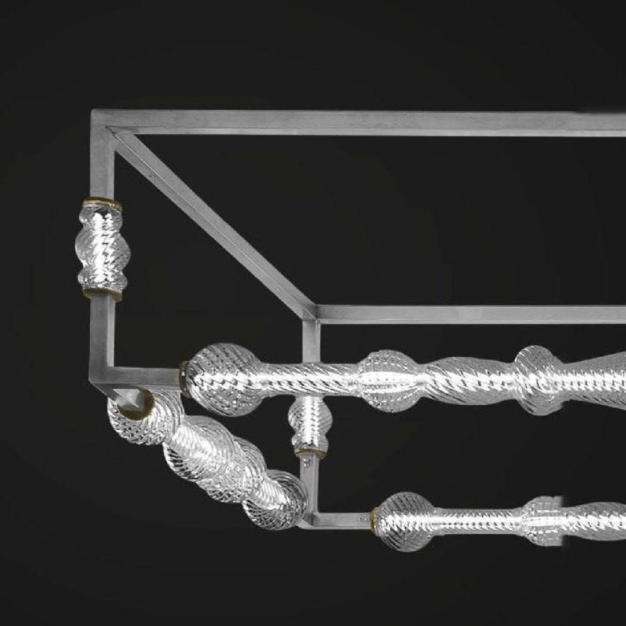 Multifunctional lighting structure made of satin steel pipe with squared section and brass details with hard blown crystal colour Murano glass.