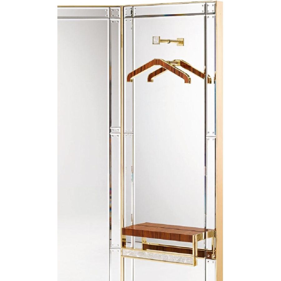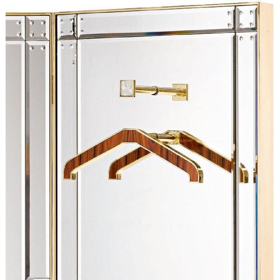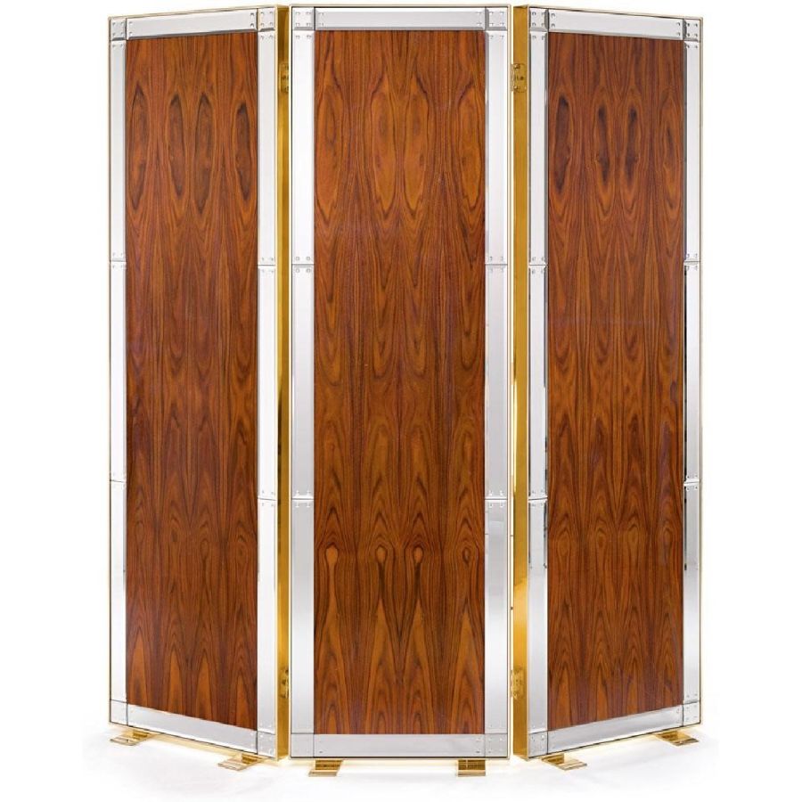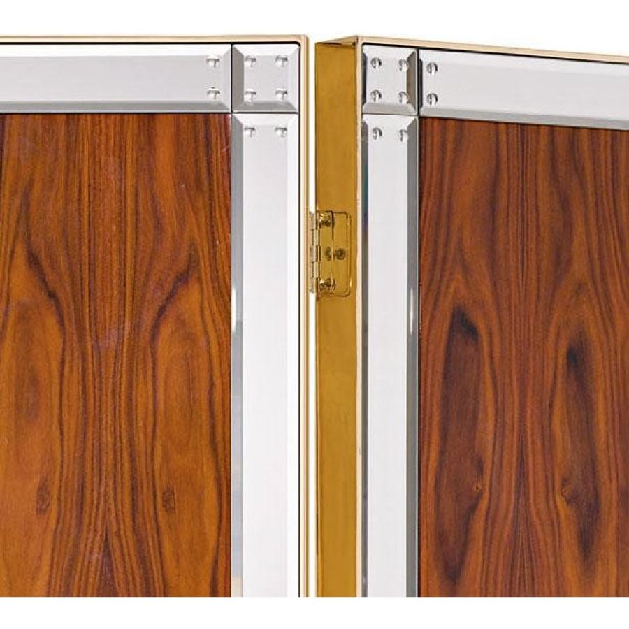 Shiny rosewood screen with inserts in brass and bands in bevelled and engraved extra clear mirror. Hand engraved “battuto” mirror details.