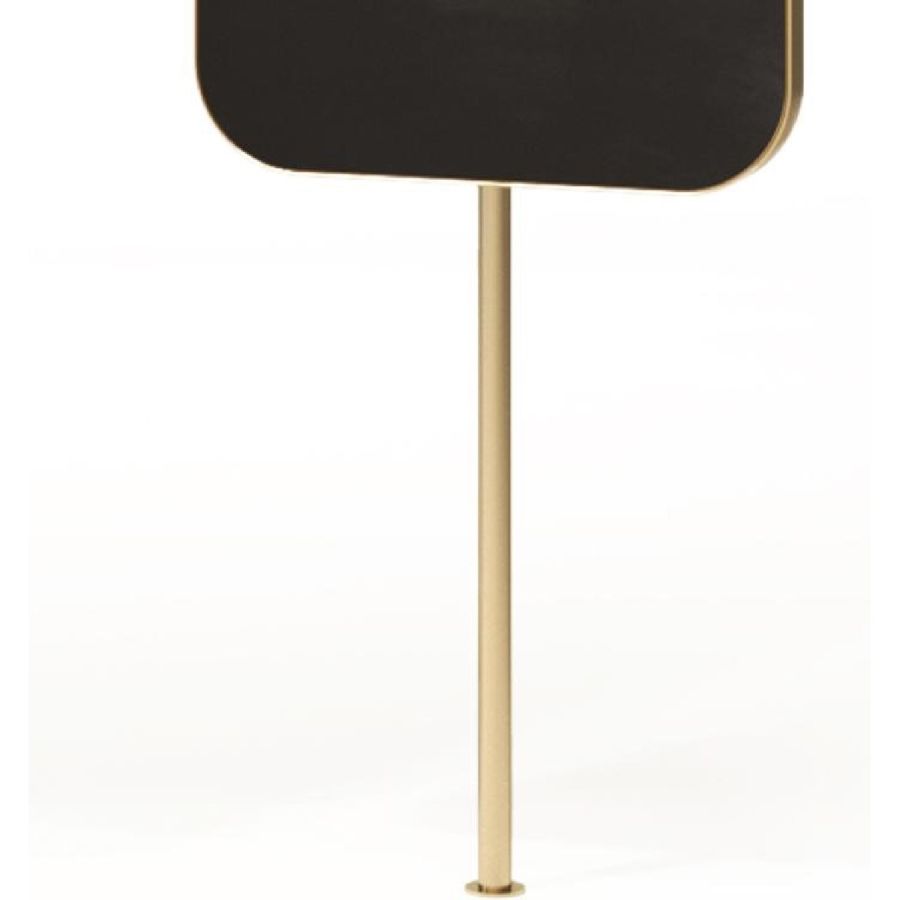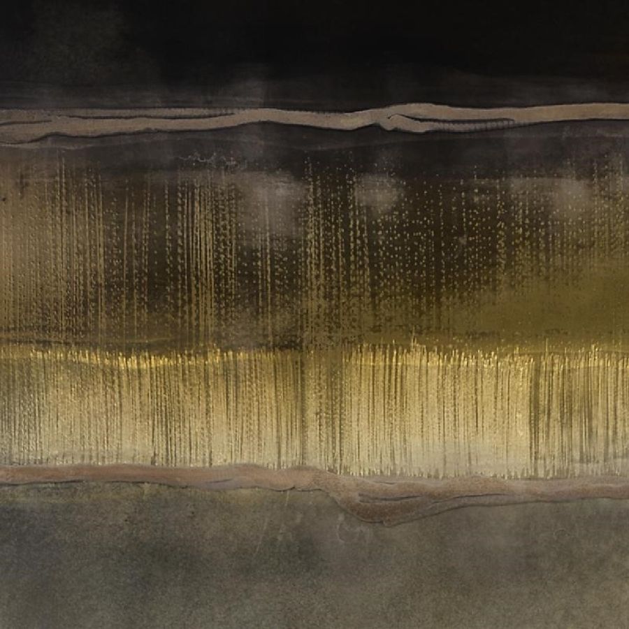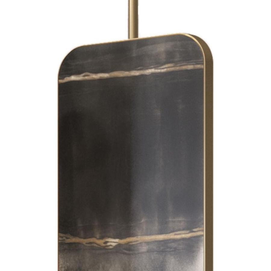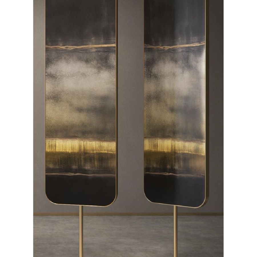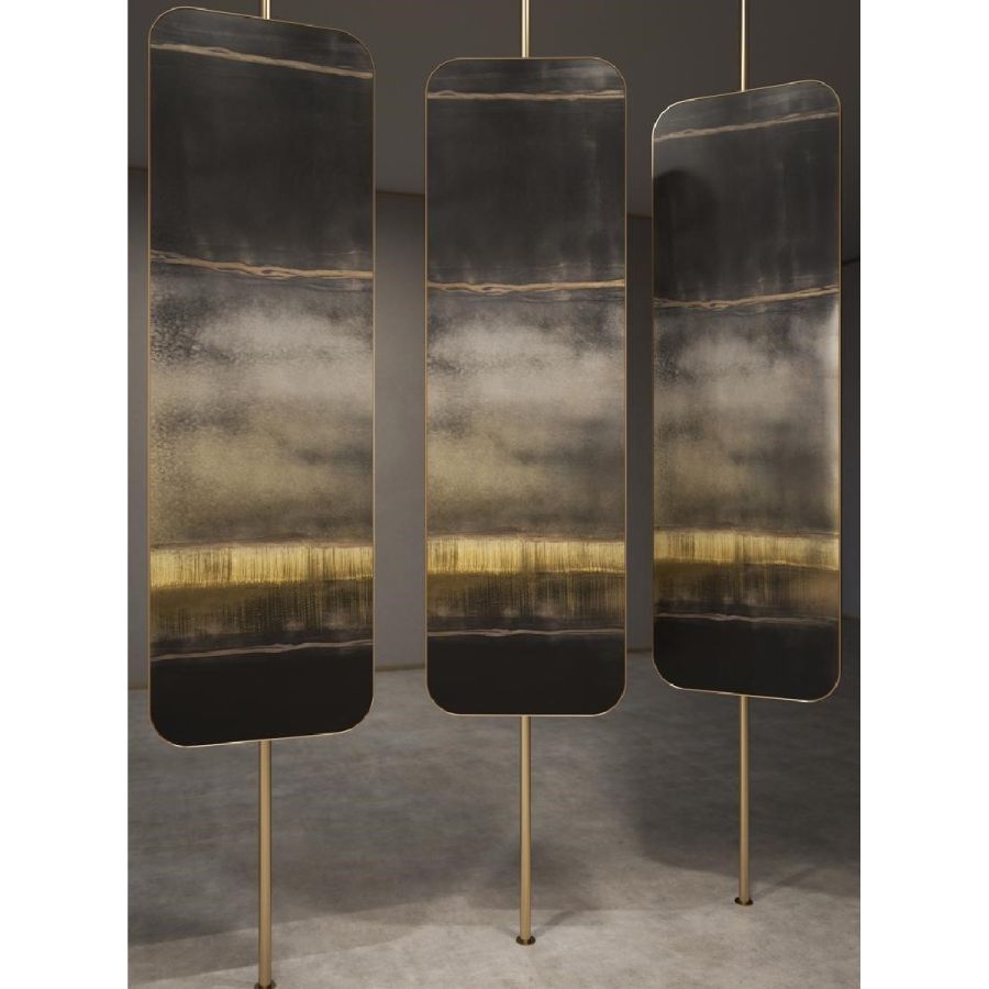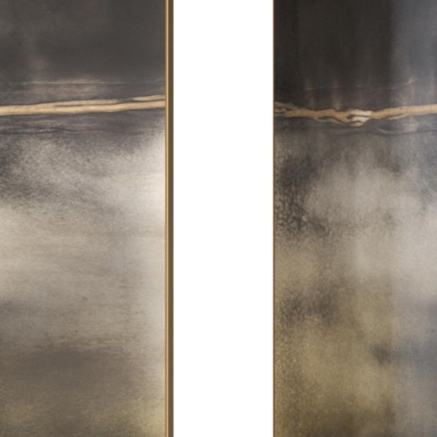 Screens in burnished brass structure on a swivel system. Interior plates made of extra-clear acid-etched glass, 6 mm thick, decorated with Lipari finishing.
