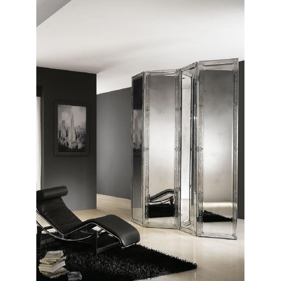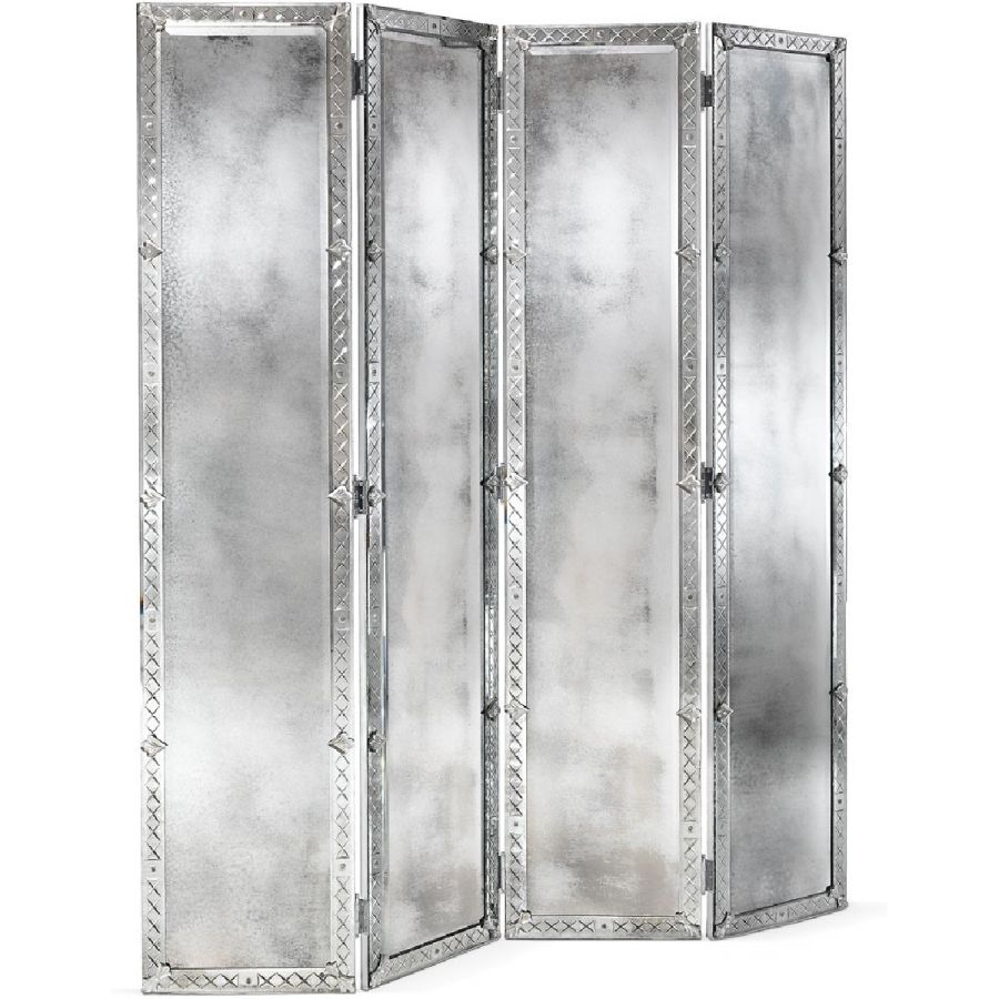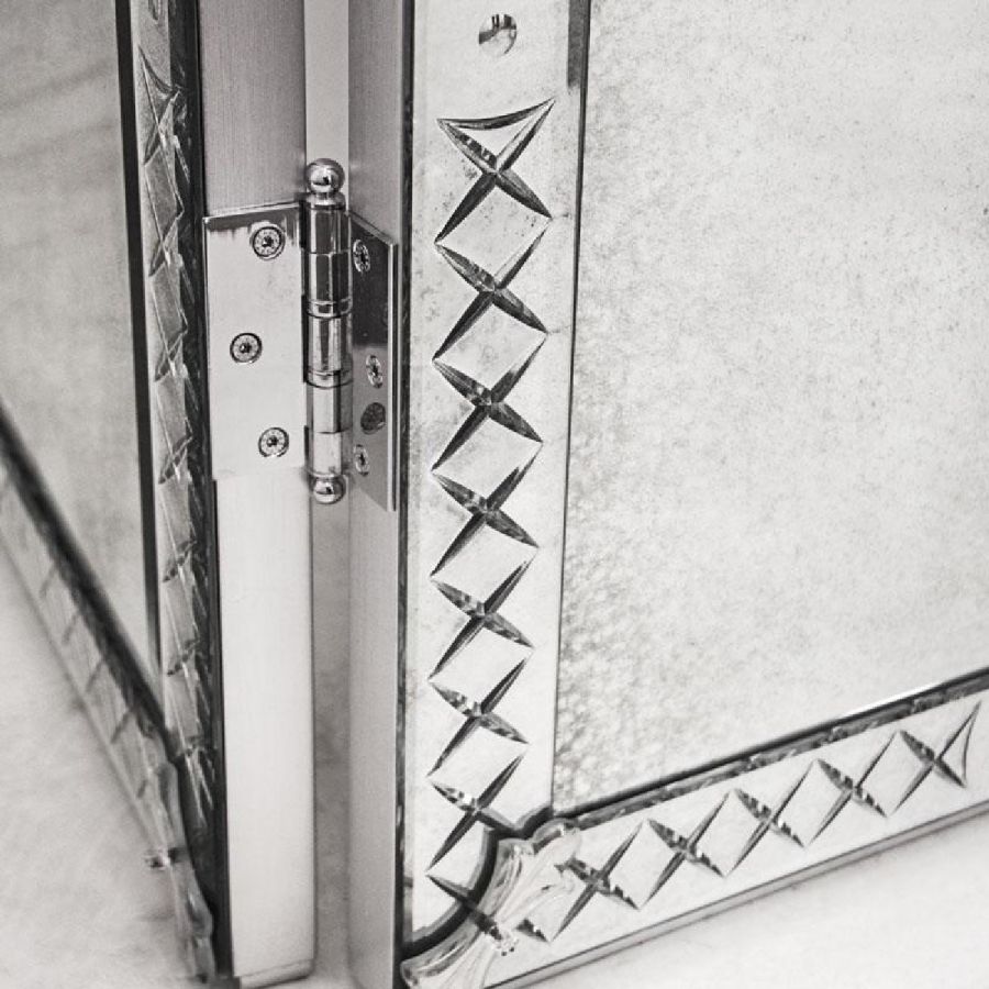 Four panel accordion structure made of wood. Perimetral edges and back made of wood with silver leafed finish.Panels made of bevelled glass sheets with medium antique mirrored finish. Frames made of bevelled and engraved glass with medium antique mirrored finish.