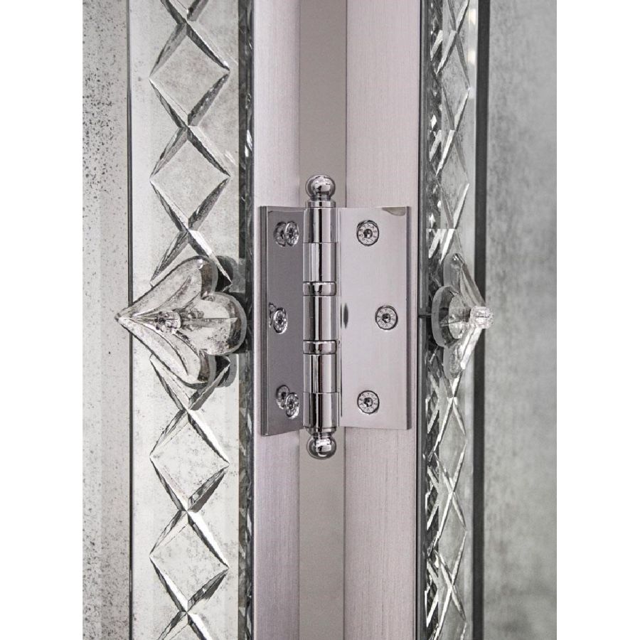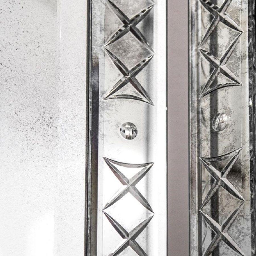 Crossed lines motif engravings. Decorative glass tiles made of bevelled glass on each corner and along the frames.