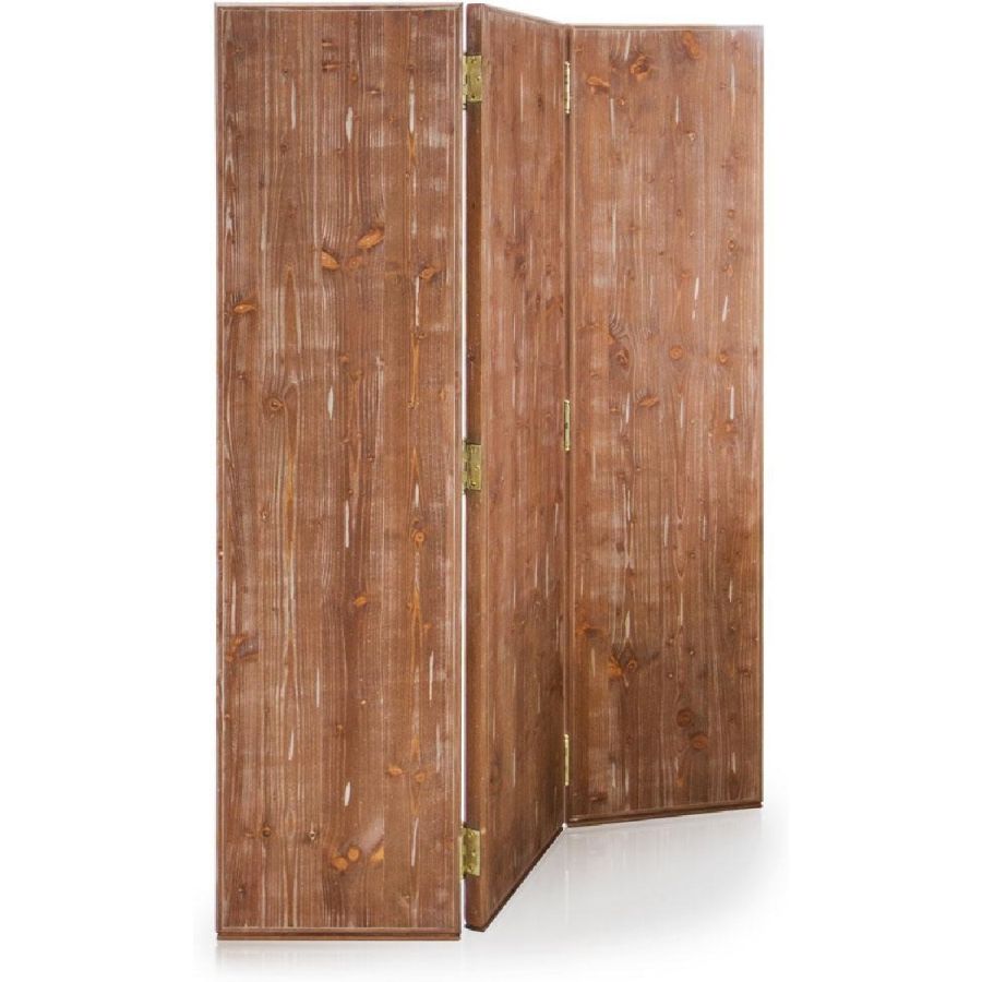 Three panel accordion structure made of fir wood. Frames and back made of solid fir wood with antique finish. Six hinges made of brass with antique finish. Three engraved glass tiles on each panel with heavy antique mirrored finish.