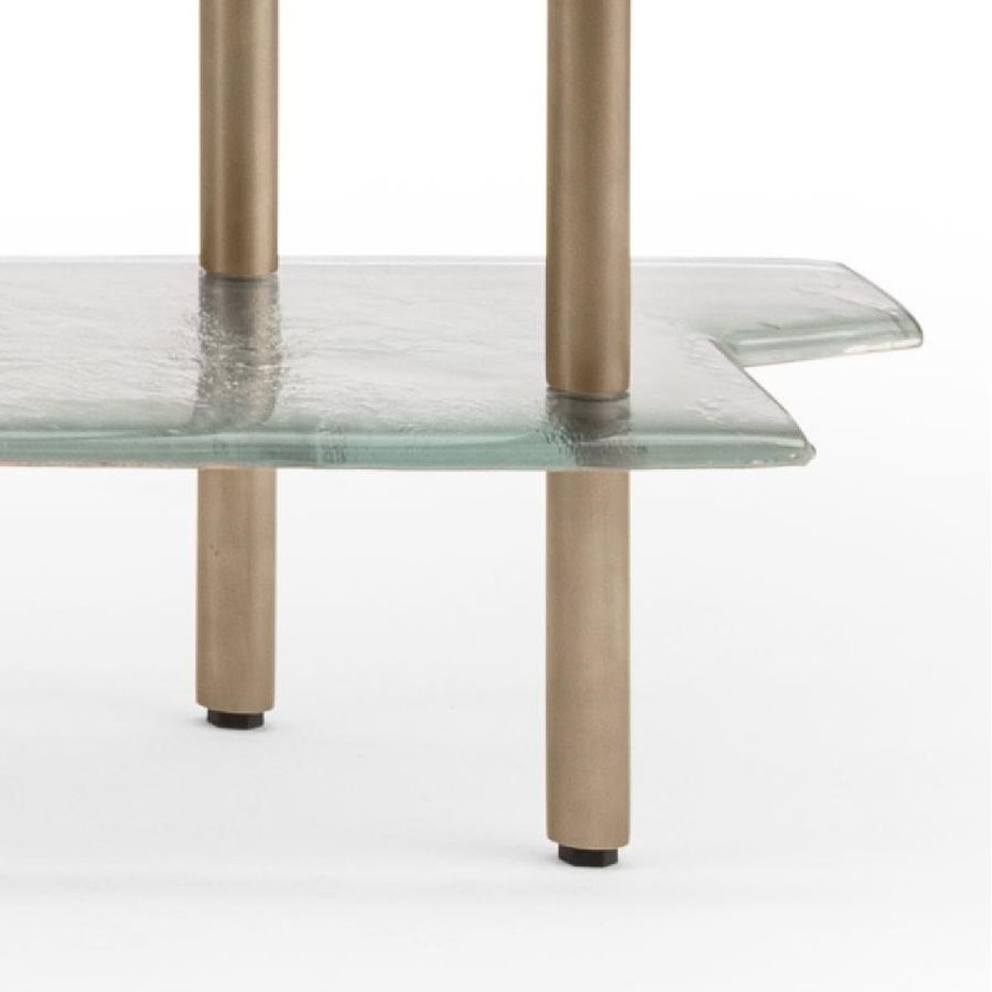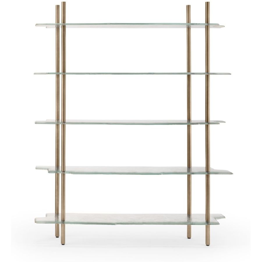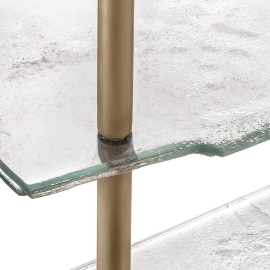 Shelves made of baked glass in two layers with irregular edges and partial silvering on the back. Metal frame with burnished brass finish.