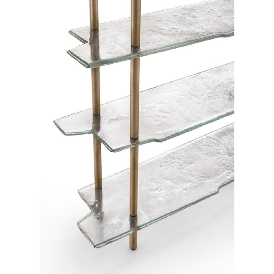 Arte Veneziana's shelves are a sophisticated synthesis of utility and artistic refinement. Designed for those who appreciate craftsmanship and timeless design, each shelf is a testament to the brand’s commitment to Venetian tradition and contemporary elegance. Made with engraved glass, hand-polished metal, and finely carved wood, these pieces offer an elegant solution for displaying objects while adding an ornamental dimension to the space.