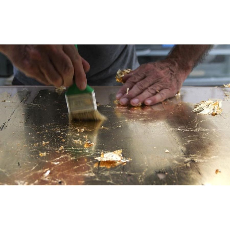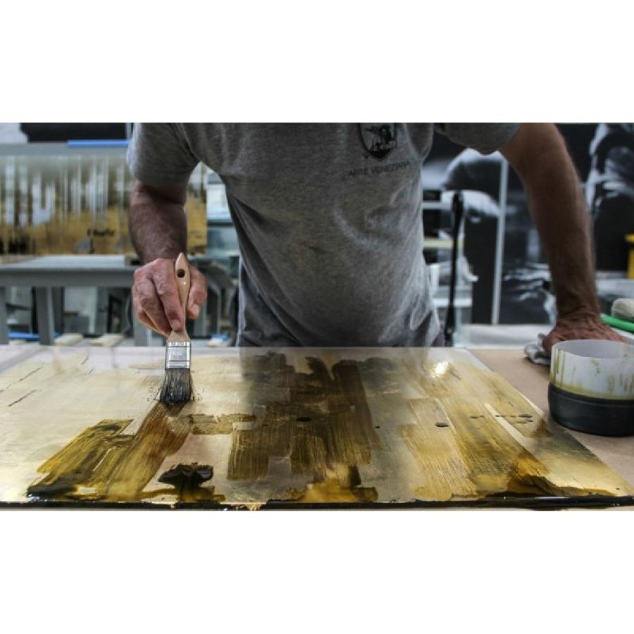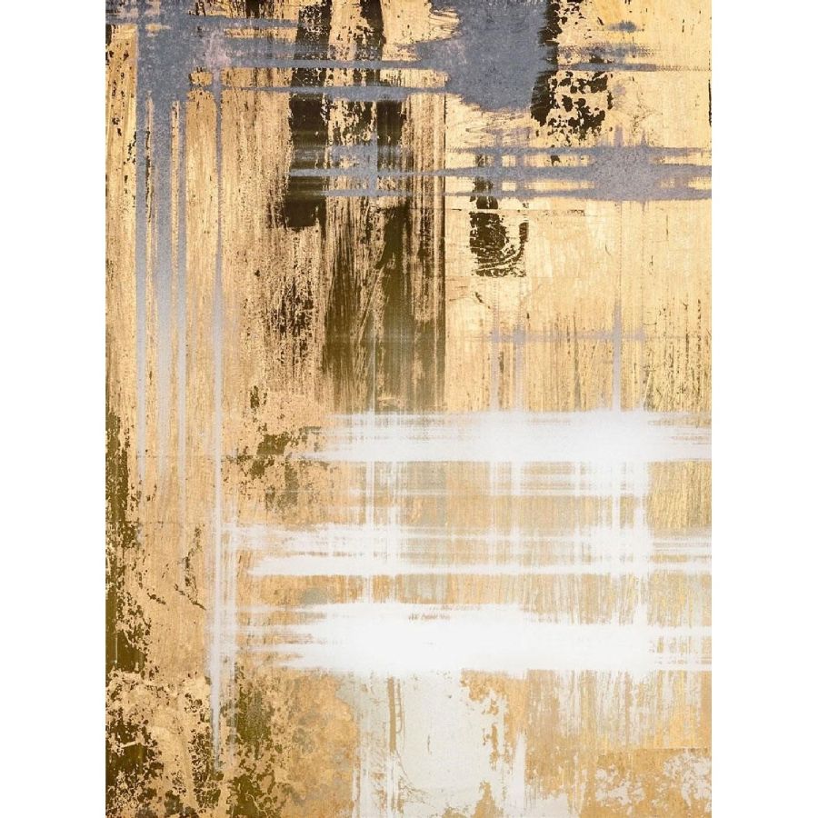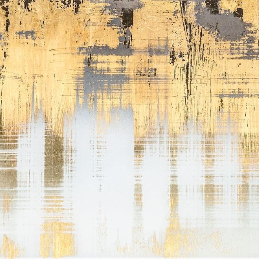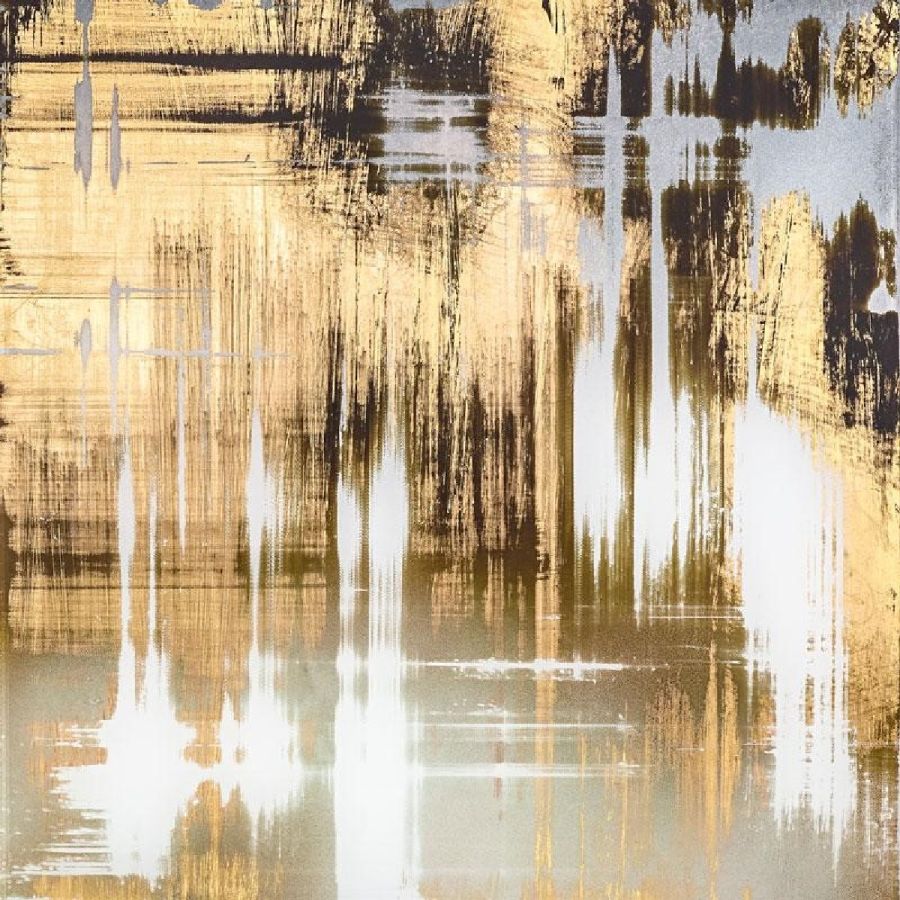 “Girgenti” decor with white and ochre varnish hues on a scratched gold leafed pattern.