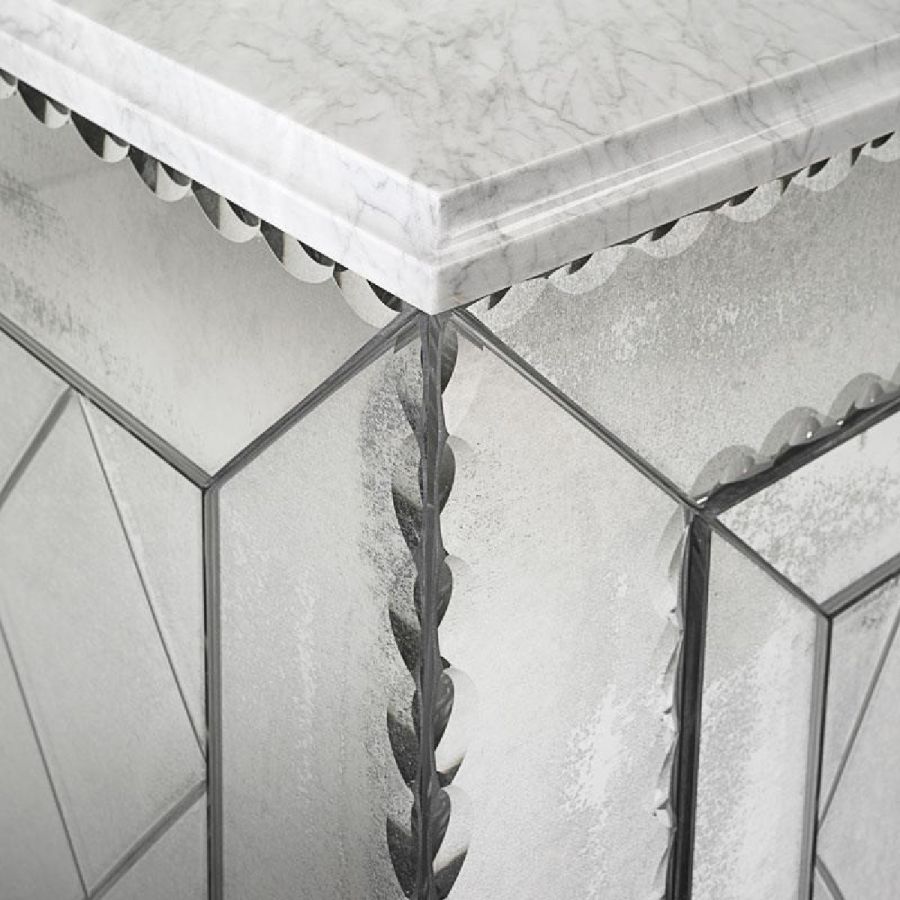 One adjustable wooden shelf with silver leafed finish in each compartment. Top made of white Bardiglio Nuvolato marble.