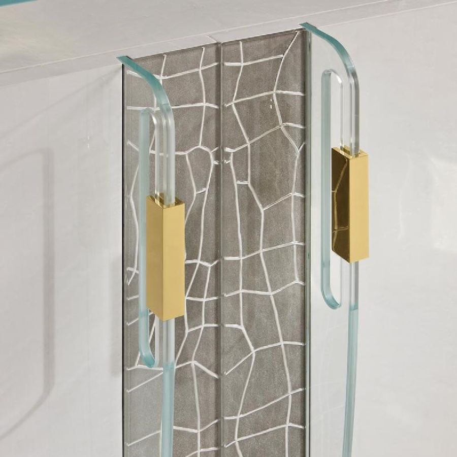 One glass shelf on the inside of each compartment. Handles made of glass with shiny brass details.