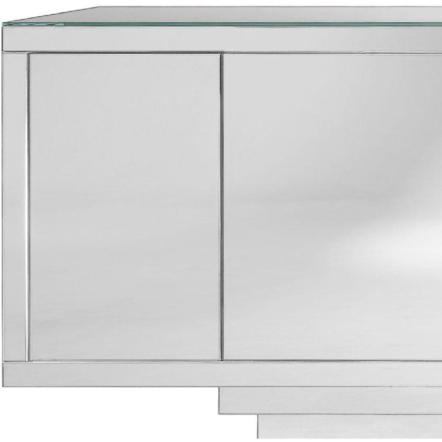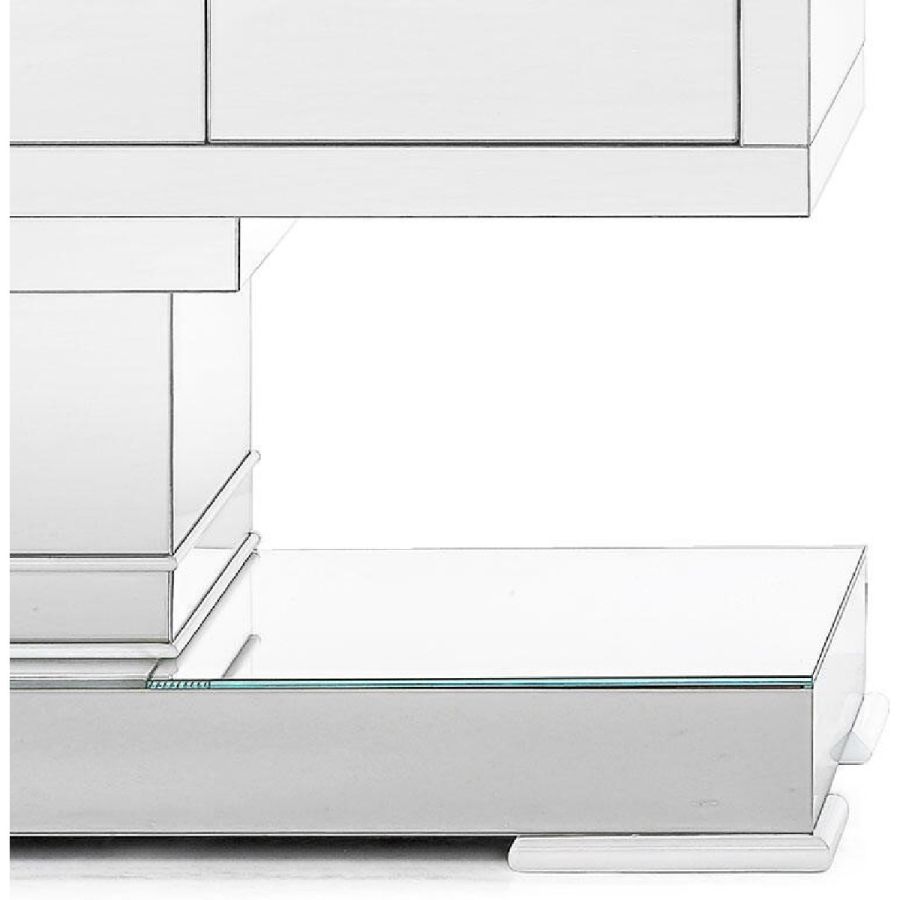 Back and inside made of wood with white shiny lacquered finish. Four drawers on the inside of the central doors. Bevelled top, doors, sides and base made of clear mirrored glass.