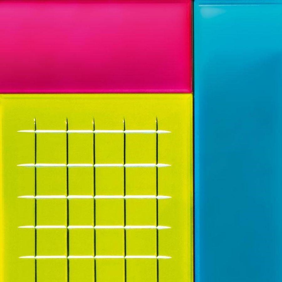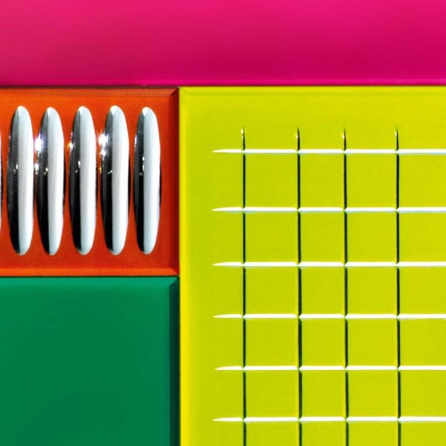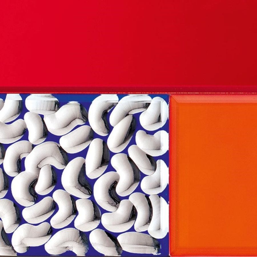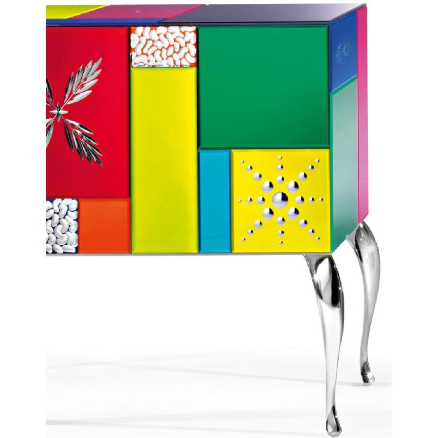 Top, doors, sides and back-side made of multicoloured and lacquered glass.