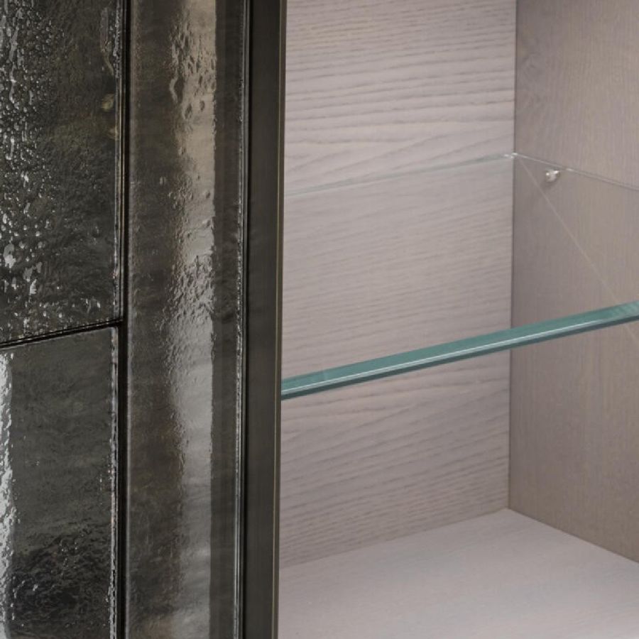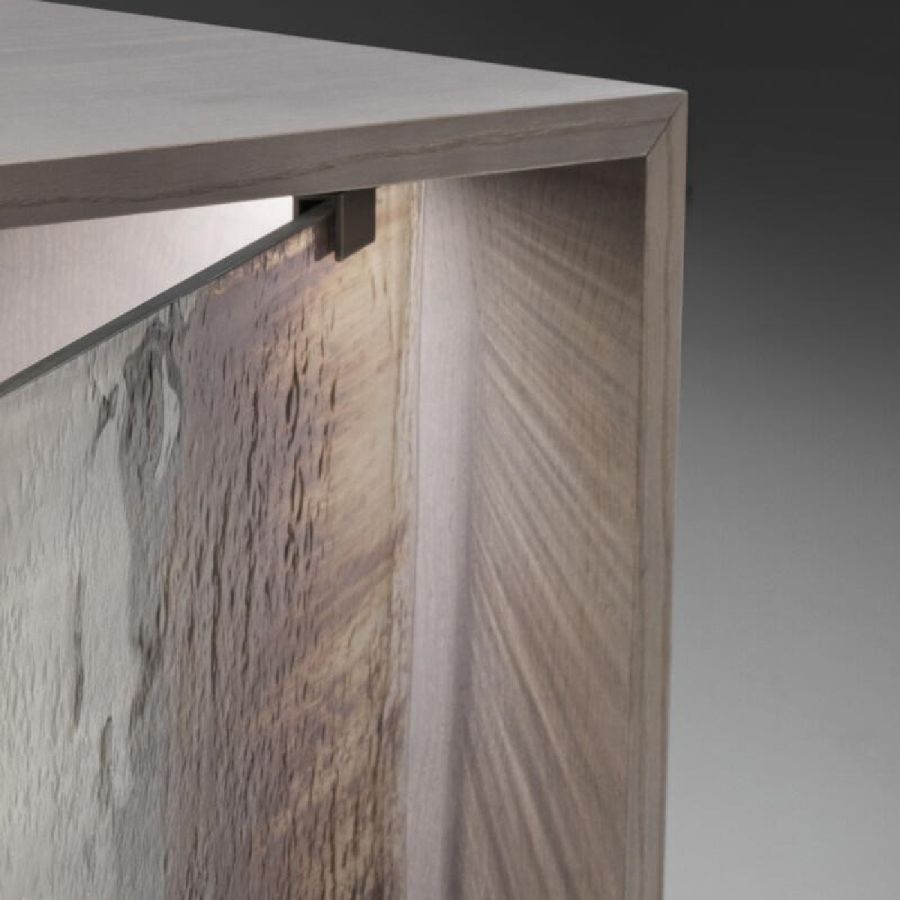Structure in ash wood with Alba finish. Two 8 mm thick tempered glass doors with Barbaresco and Roddi finish with brushed burnished brass finish metal hinge.