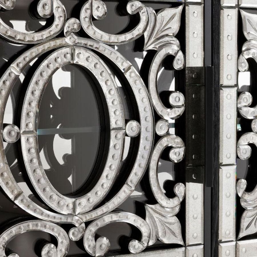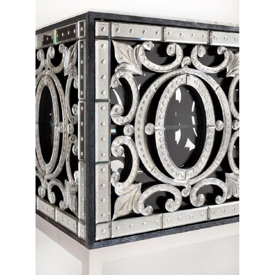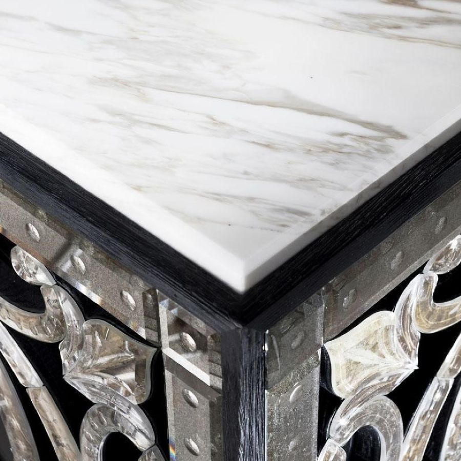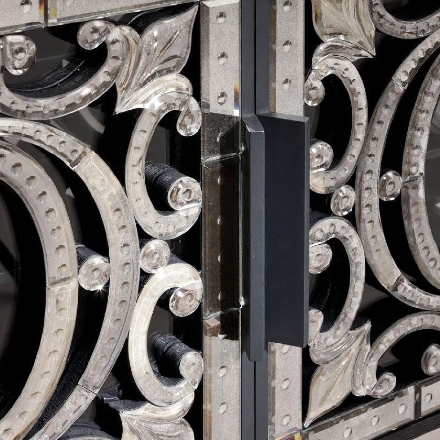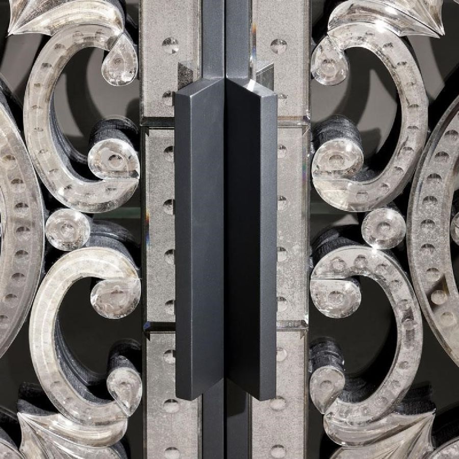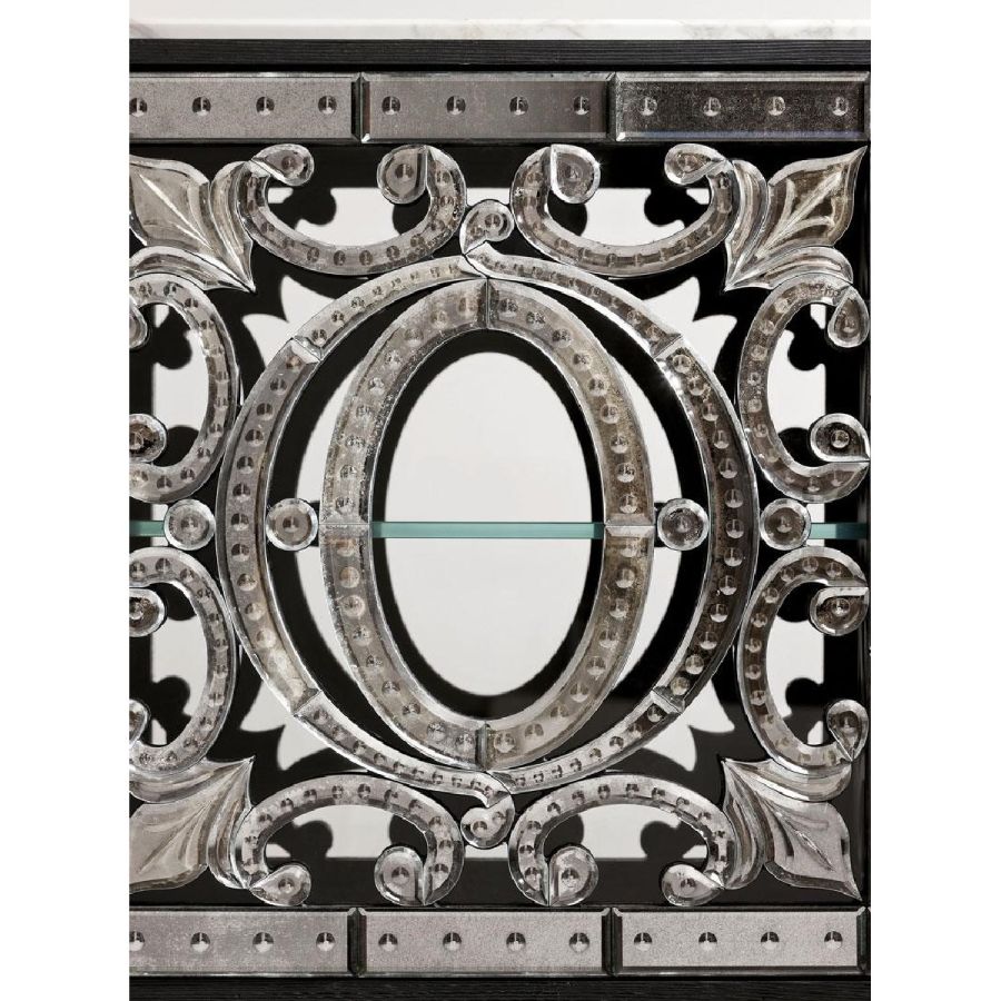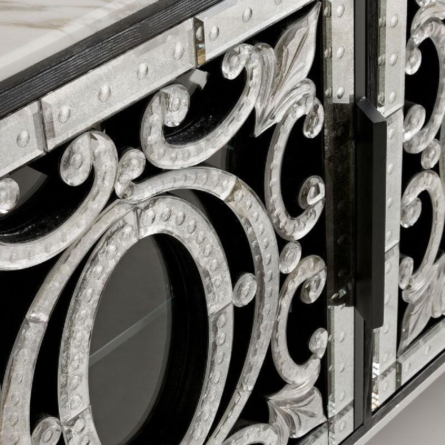Bevelled top in Calacatta marble. Doors, sides and back made of bevelled and engraved glass with medium antique mirrored finish.