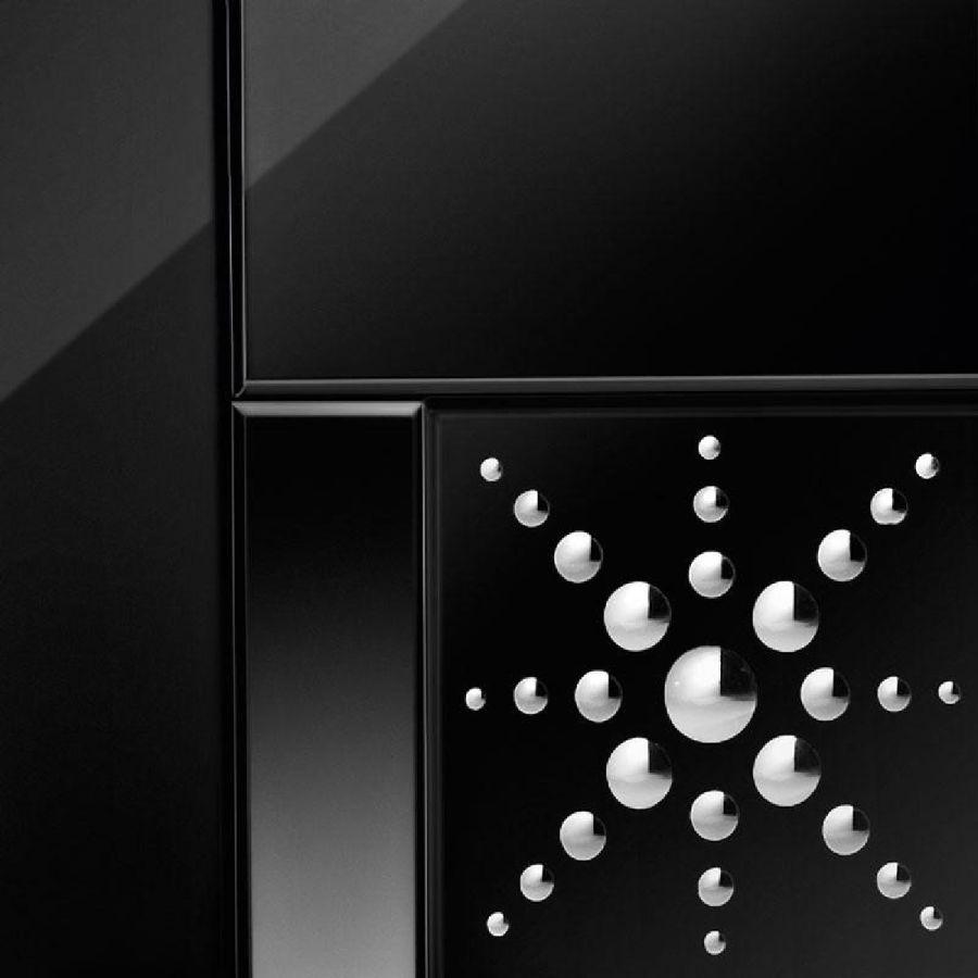 Top, doors, sides and back made of black coloured and lacquered glass.