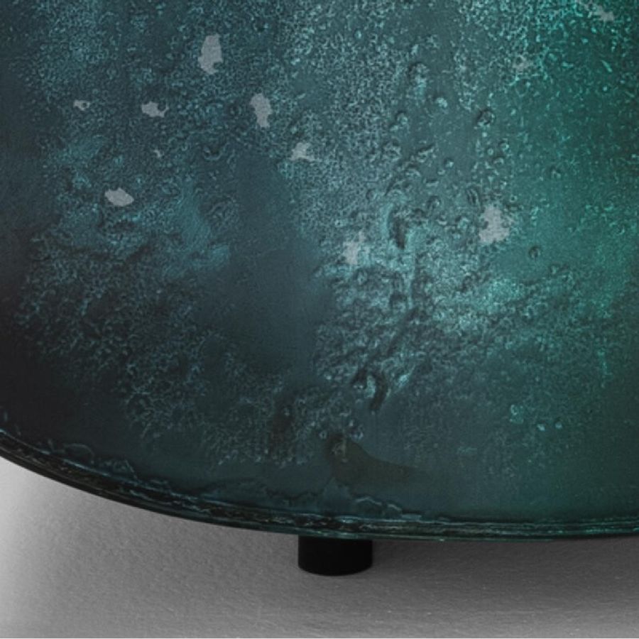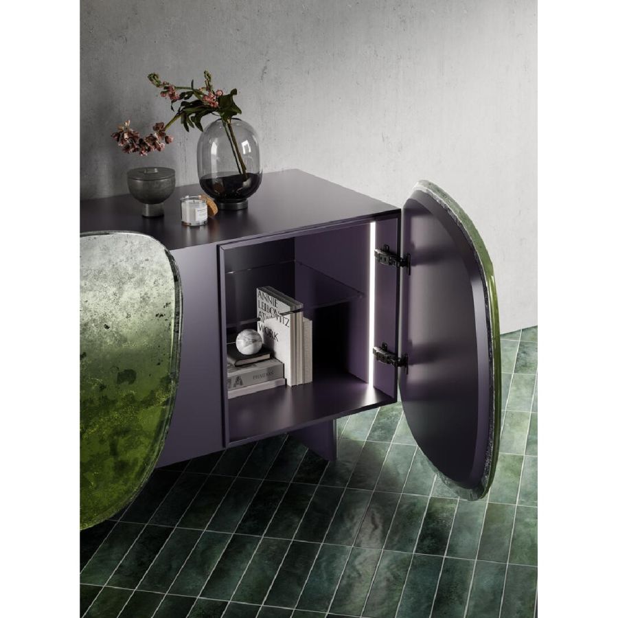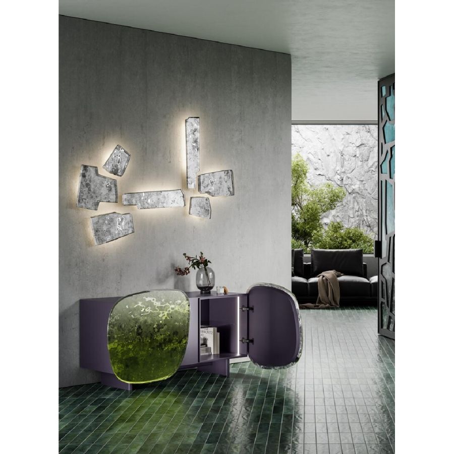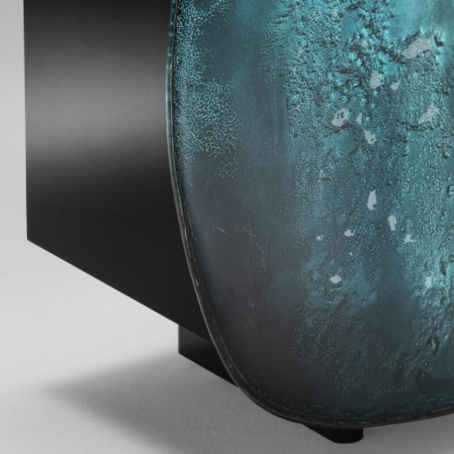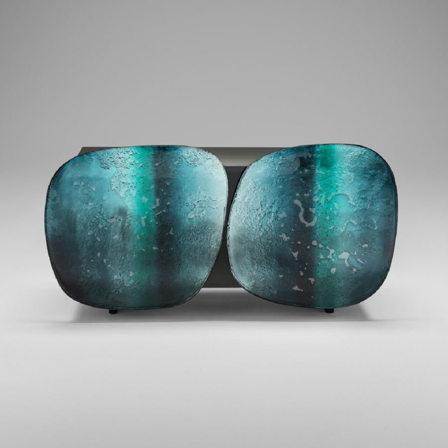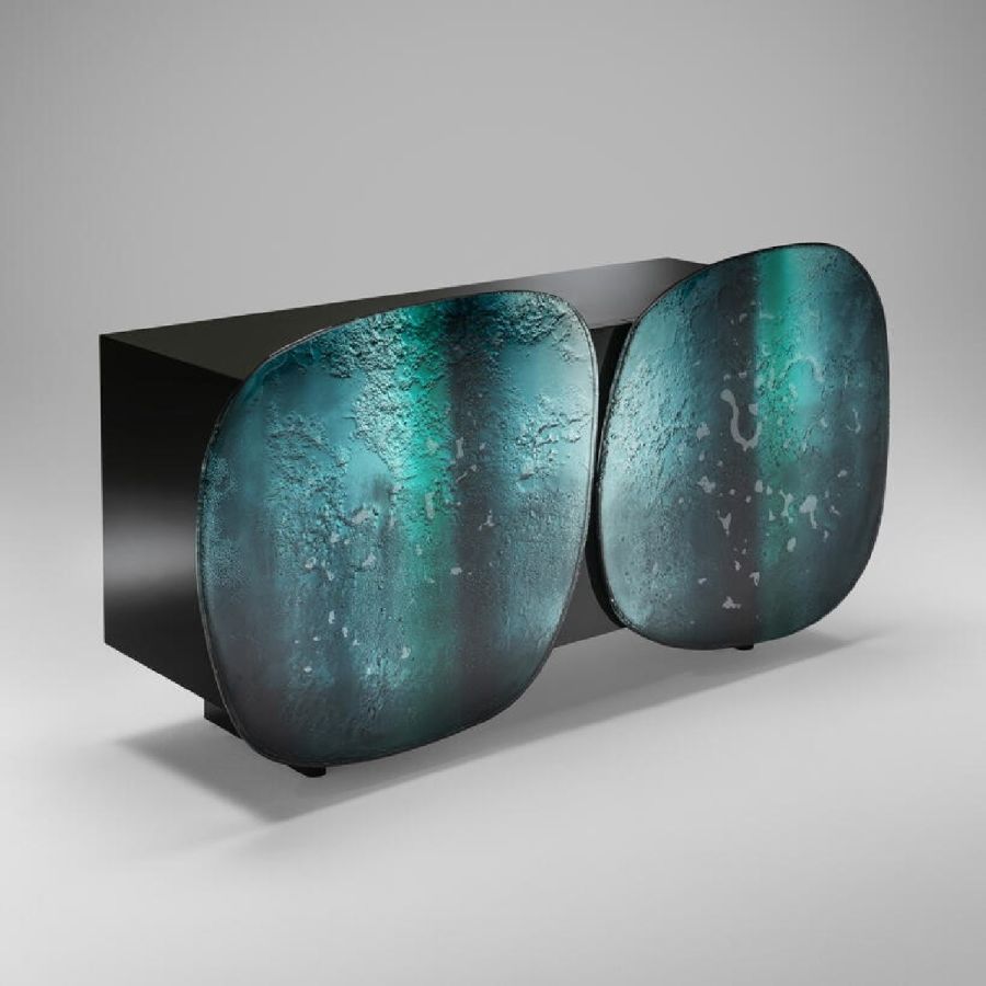 Doors in baked glass in two layers with irregular edges, decorated with ‘Forest’ finish and silvered with medium antique finish on the back. Wooden frame with bottle-green glossy lacquer finish.