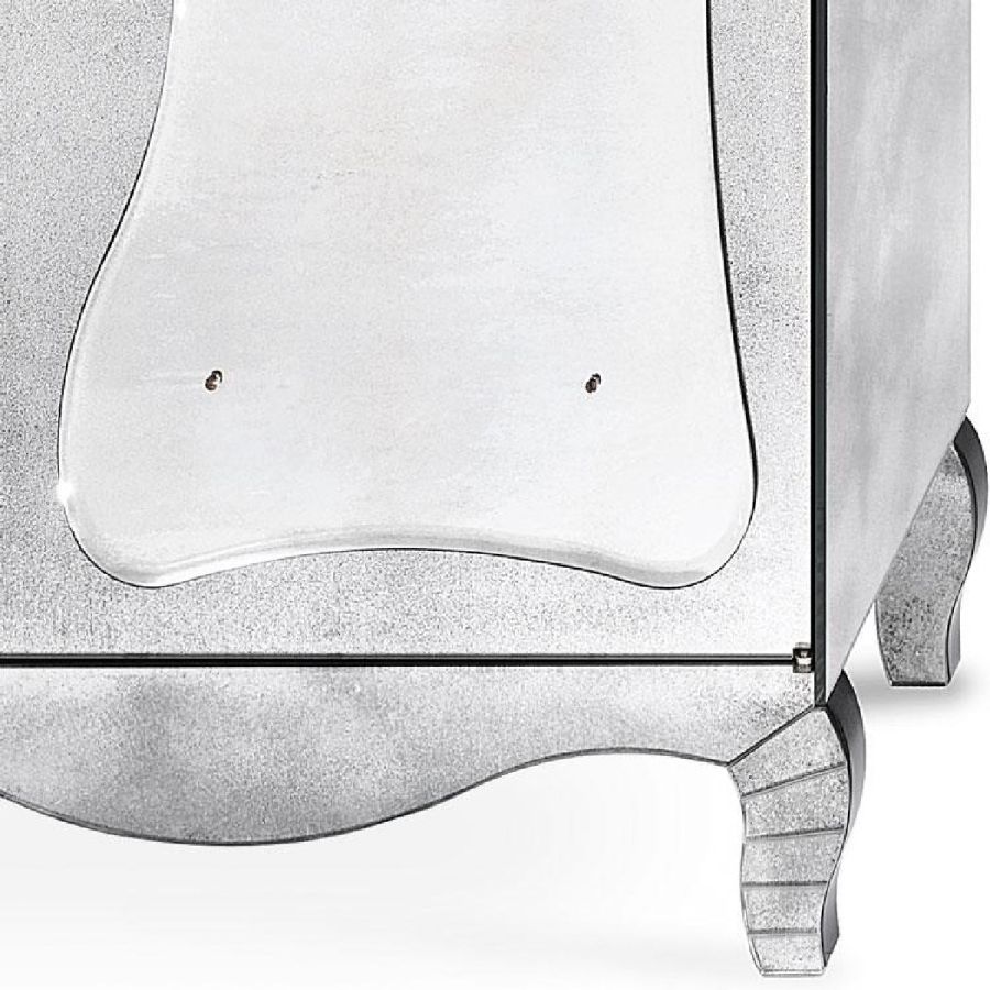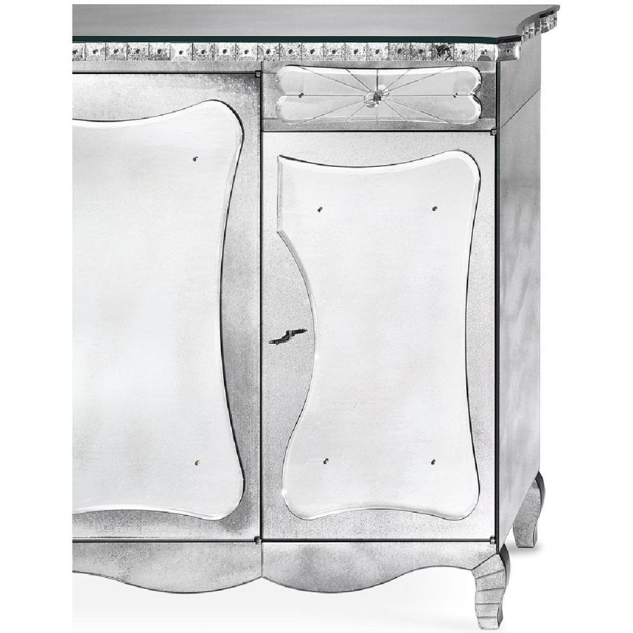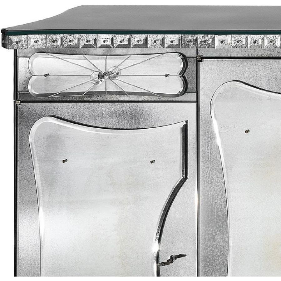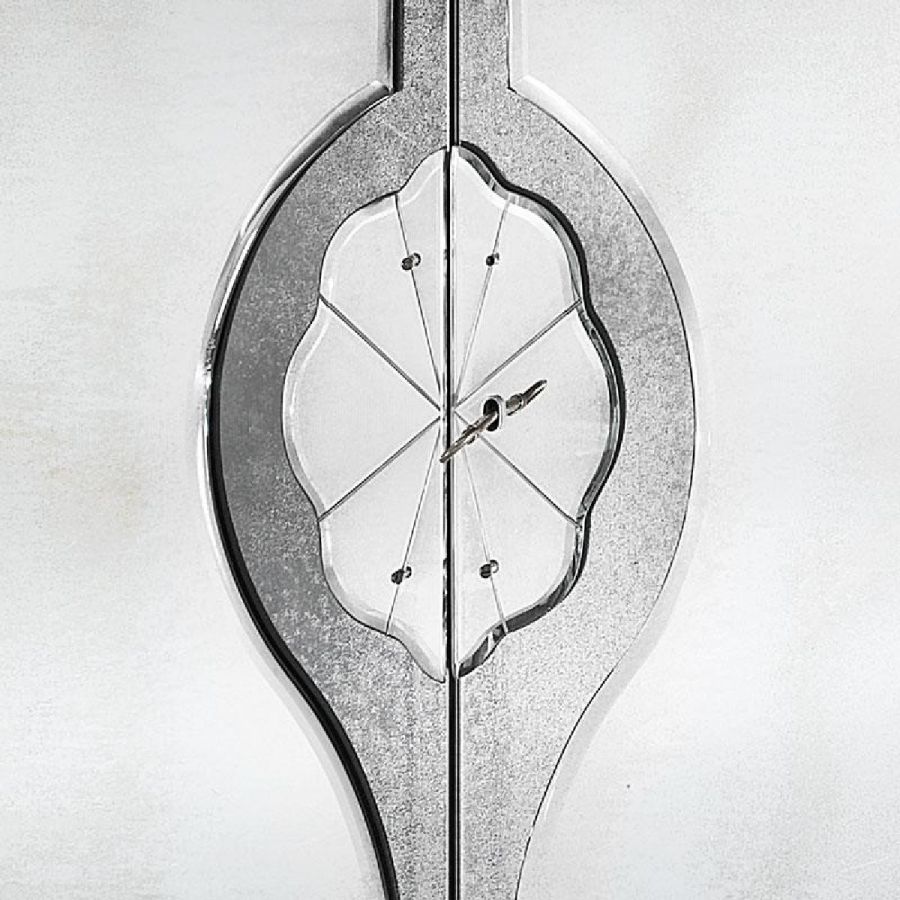 Back made of wood. Doors, sides and legs made of heavy antique mirrored glass. Shaped top, front doors and drawers made of bevelled glass with light antique mirrored finish.
