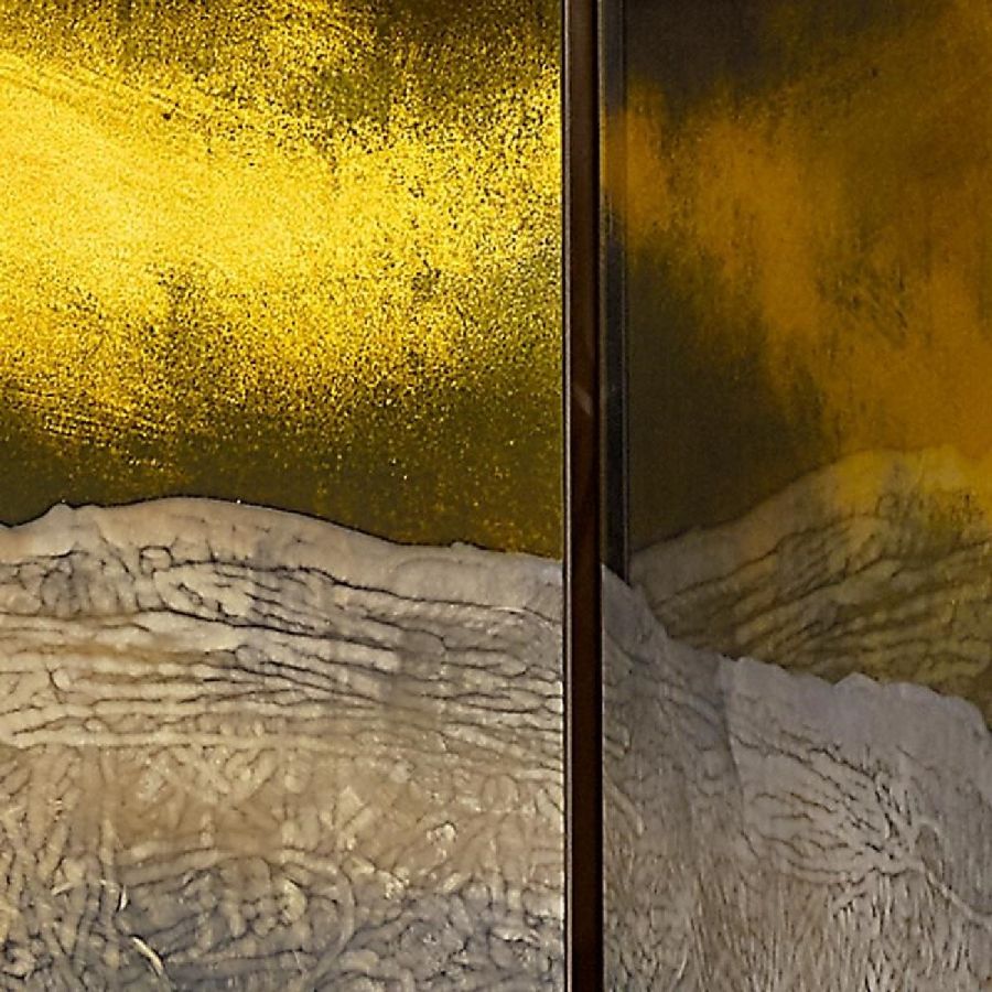 Lacquered brushed ash wood veneered plywood structure. Four doors covered in extra-clear glass decorated with engravings and gold paint, all silvered with antique finish.