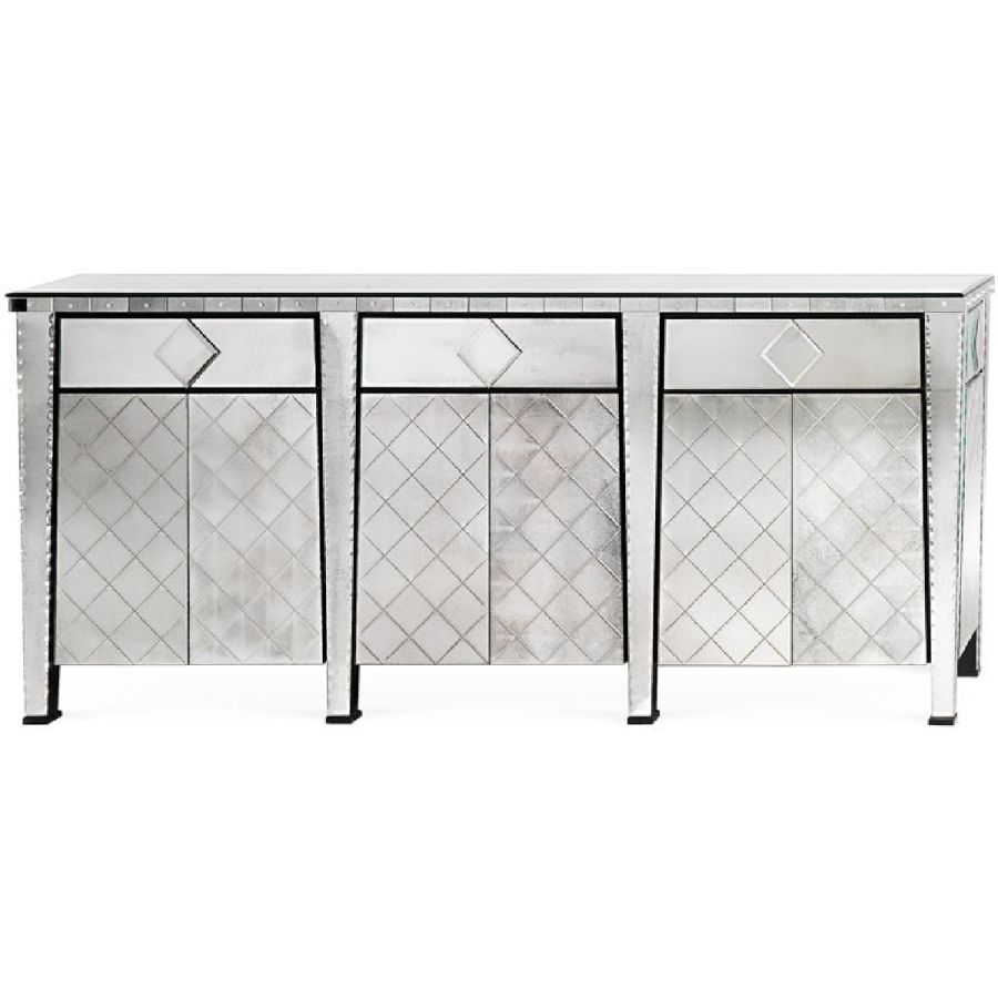 Three door and three drawer sideboard with push-pull opening mechanism. Structure made of wood with black matte lacquered finish. Glass with hand silvered and antiqued finish. Glass tiles on the upper part are fixed to the structure by glass screws.