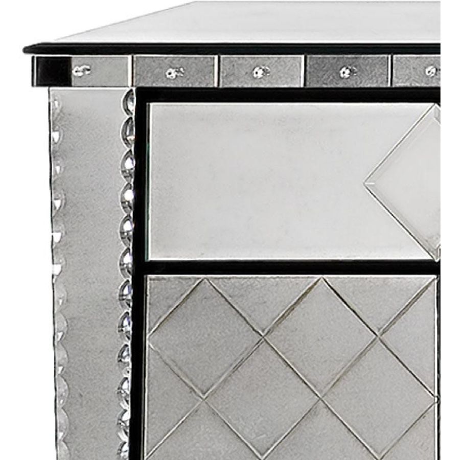 Hand beveled thumbnail decor on each glass edge. Handmade etching of 'Criss-Cross' motifs on the front and both sides.