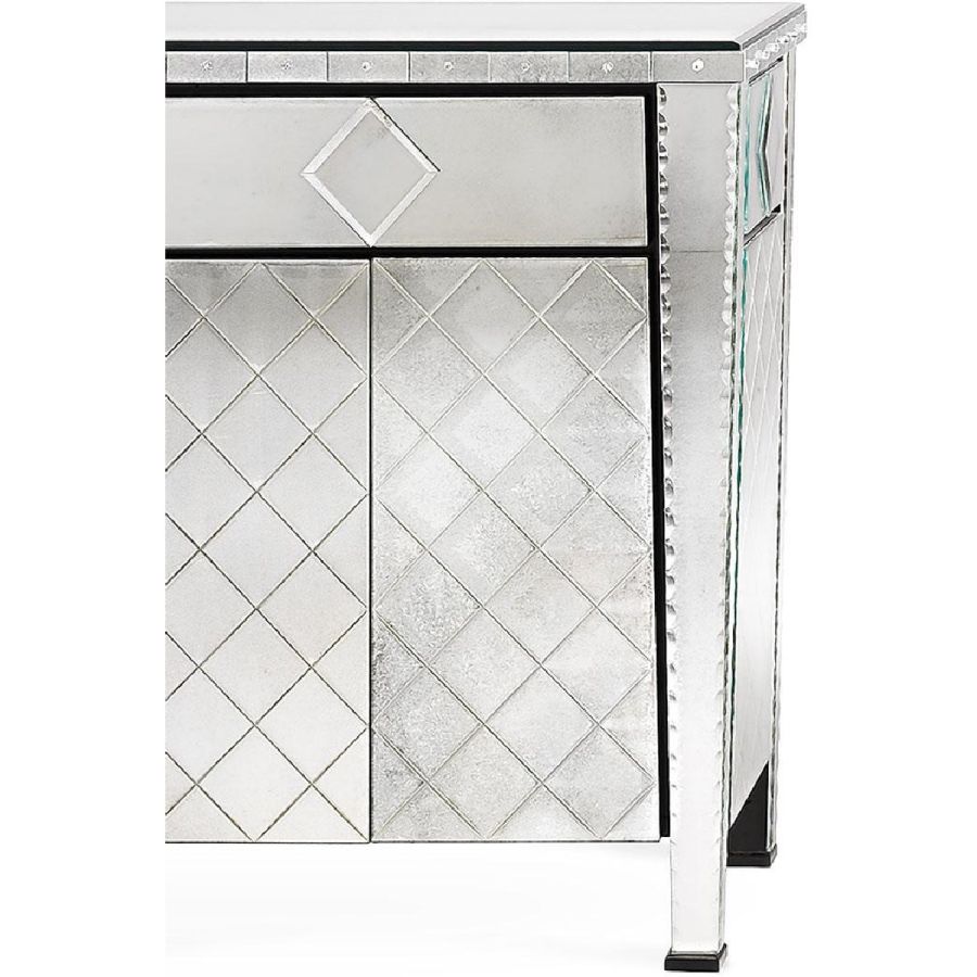 Top made of glass with hand silvered and antiqued finish. Back side made of laminate with satin aluminum finish. On the inside: black matte lacquered finishing and one adjustable shelf made of glass with hand silvered and antiqued finish.
