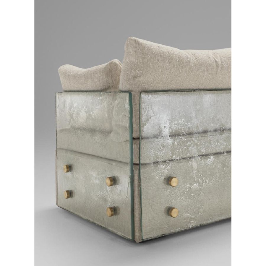 Sides and back in tempered baked glass, partially silvered. Brushed brass studs. Wooden frame with polyurethane foam upholstered seat.