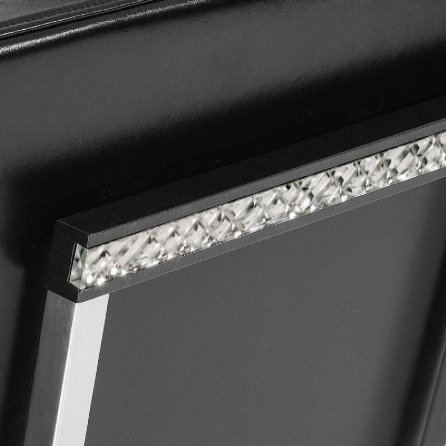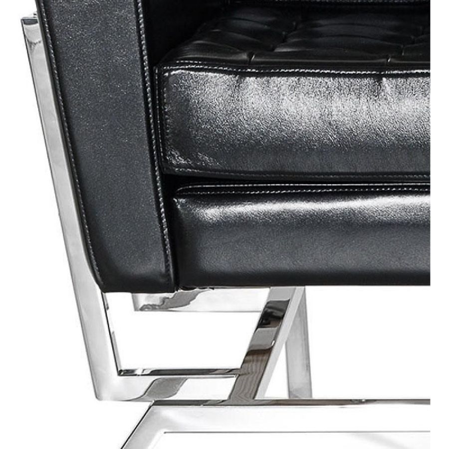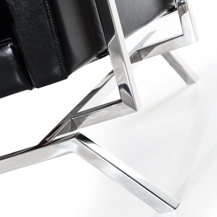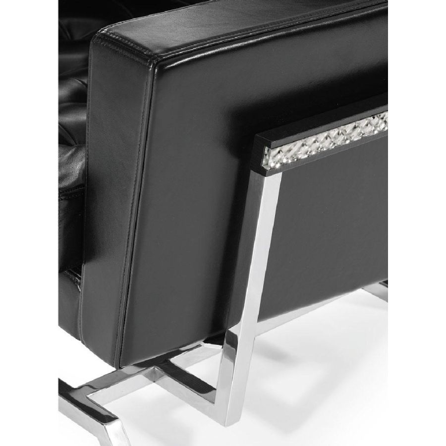 Sofa in black leather. Structure in shiny stainless steel with inserts in extra-clear mirror with handmade shiny bevellings.