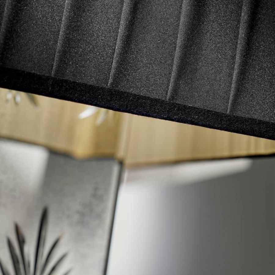 Art Déco Table Lamp covered in bevelled, hand engraved antiqued mirror with two lights. Base in shiny black lacquered wood. Lampshade in black pleated fabric.