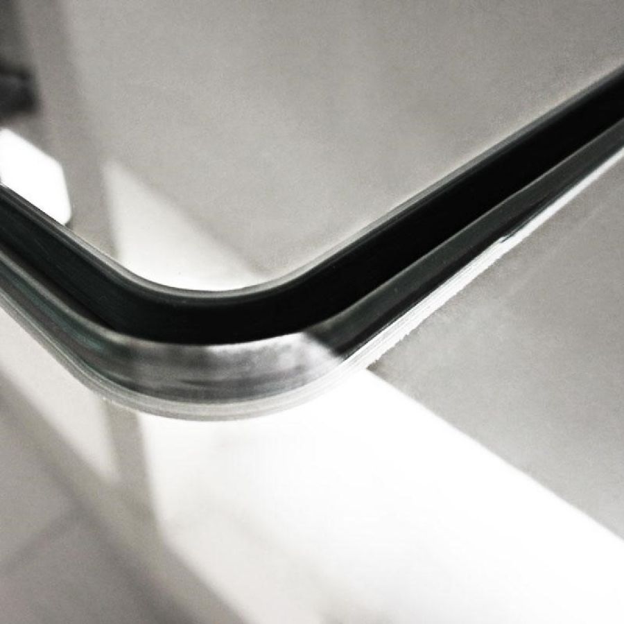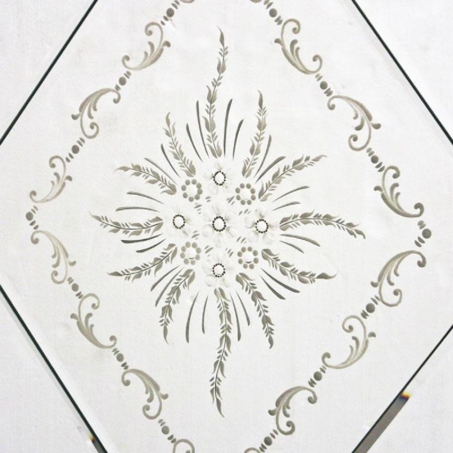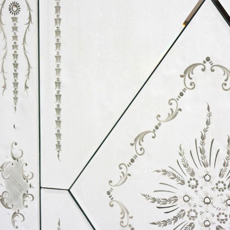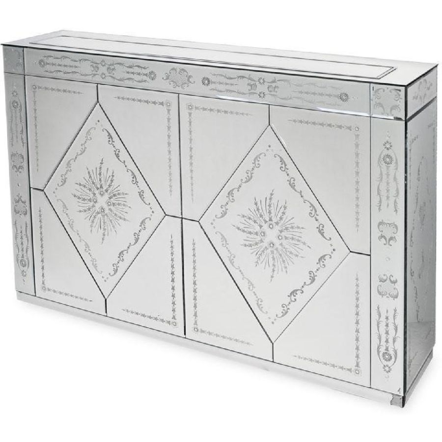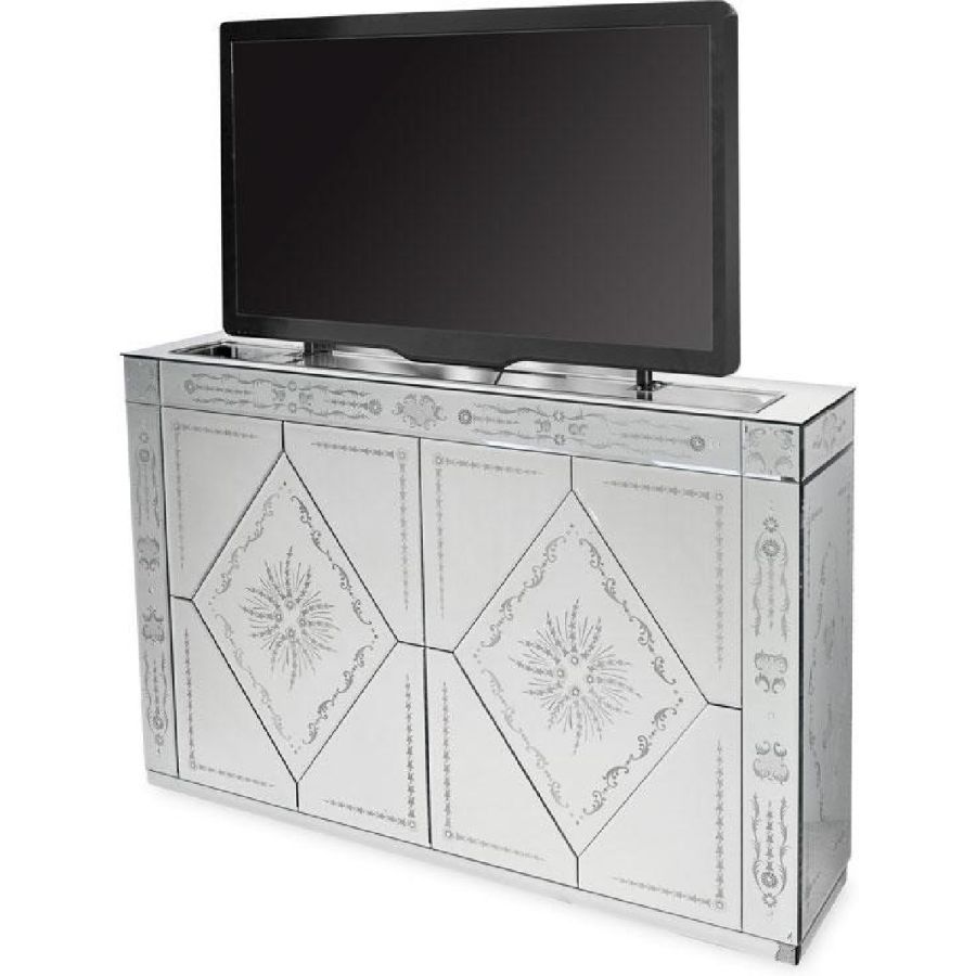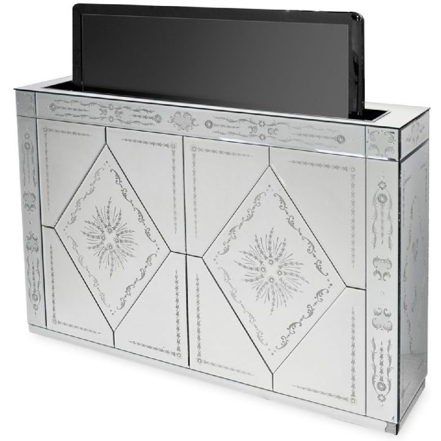 Top made of clear mirrored glass and TV lift arrangement in the centre. Back made of wood with black matte lacquered finish. Frames, doors and sides made of engraved glass with medium antique mirrored finish.