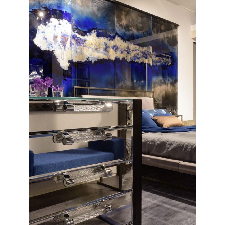The inspiration comes from nature and its landscapes. The ever shifting variety of colours and shapes are the subjects of the painted glass walls, of the pen-engraved screens, of the finishes of our furnishings. Each finish can be applied in a thousand different ways. You can furnish a wall, cover a cabinet, decorate the doors of a bespoke closet or even apply the decoration to coffee tables or nightstands and, why not, also to chandeliers with a modern twist.
