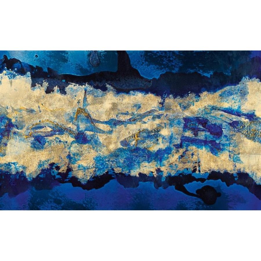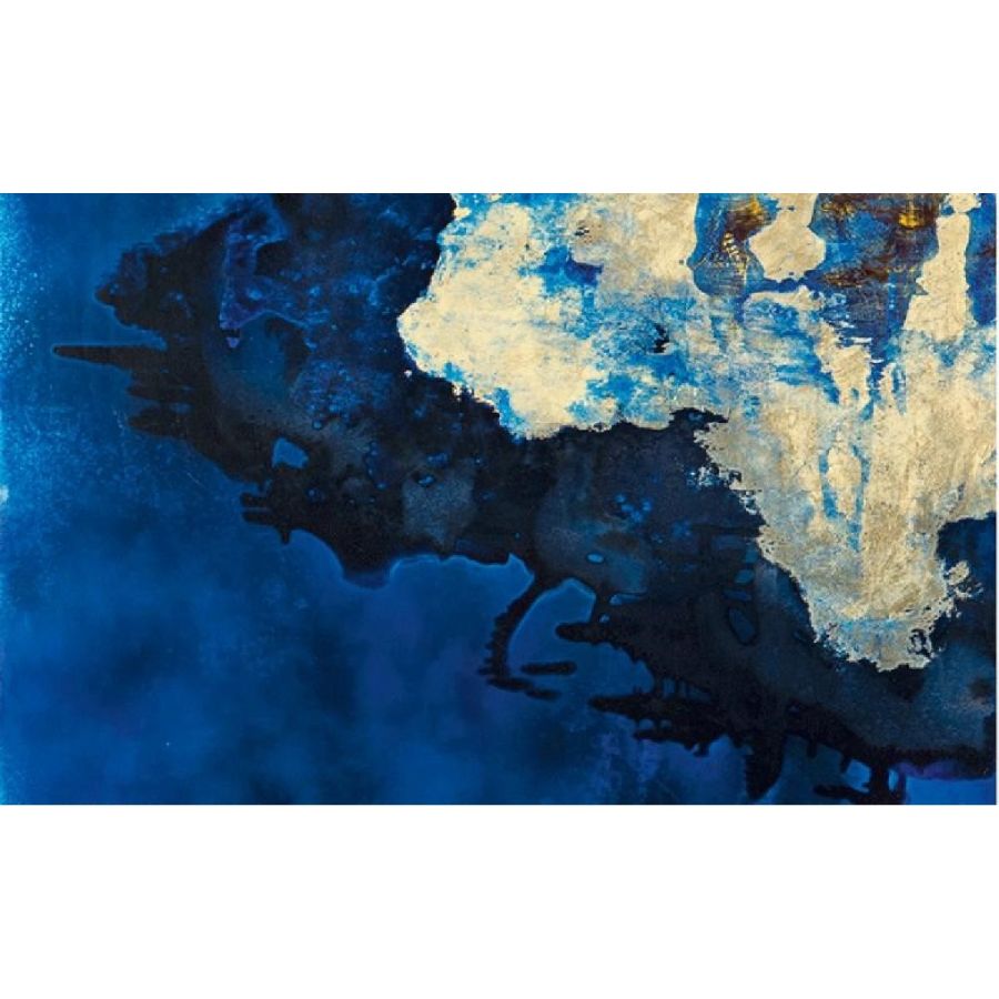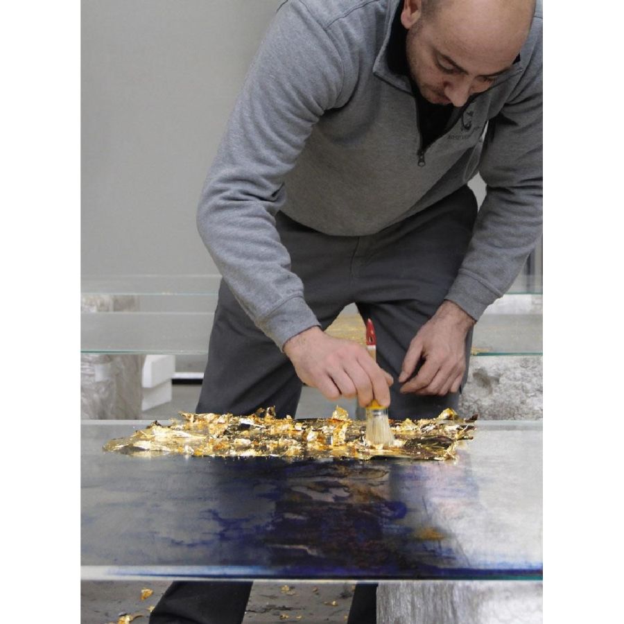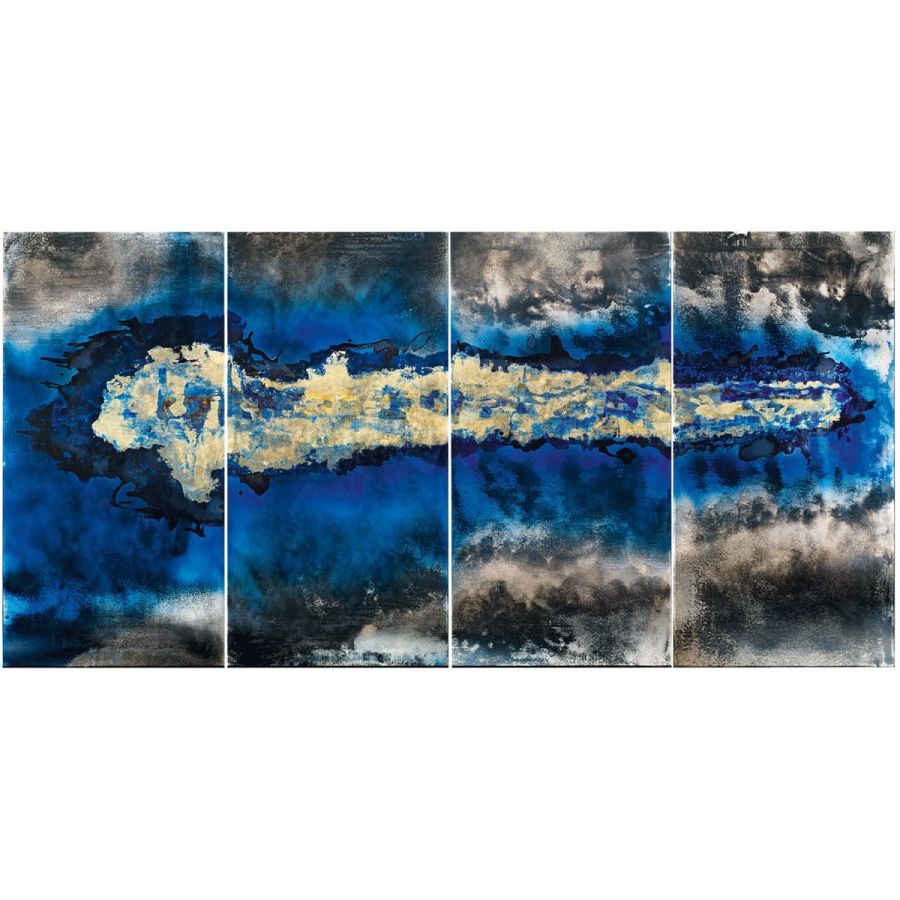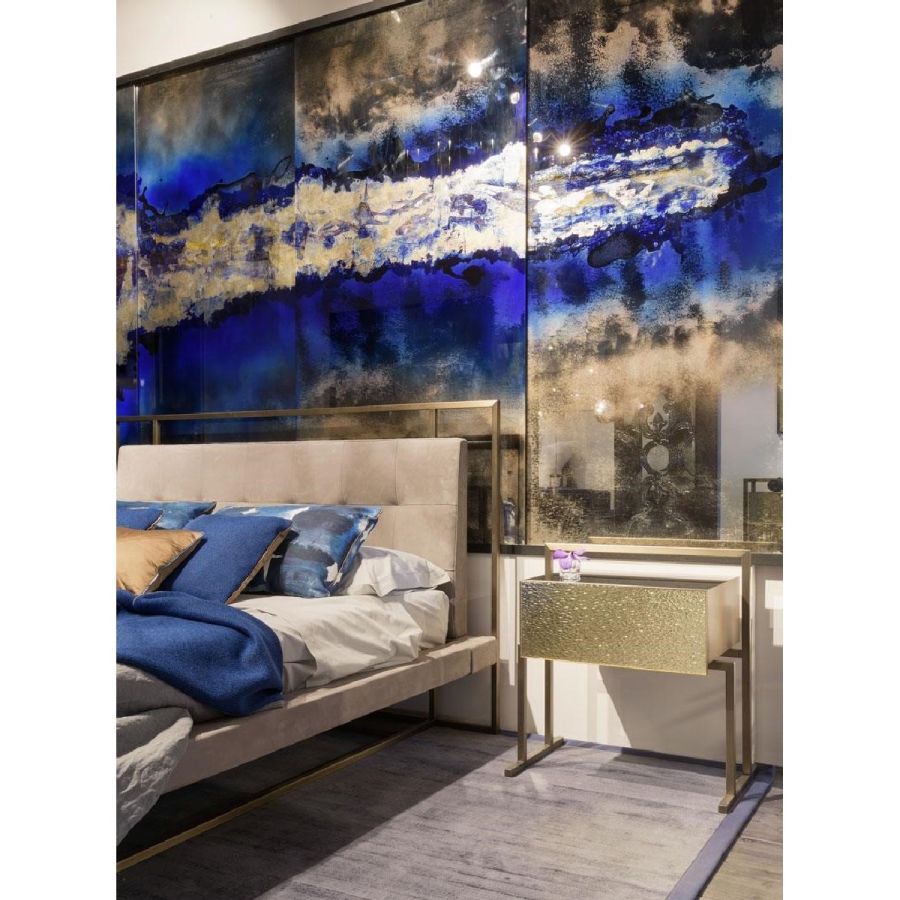 Deep Blue, the artistic finishing made of handmade decorated glass and mirror, introduces new decorative trends for luxury living. Golden leaf meets blue China varnish to give a ravishing and fascinating contemporary glass painting inspired by the blue nuance of Venetian lagoon. Design by Giovanni Luca Ferreri.Four glass panels with gold leafed and scratched decor, with various light-blue and dark-blue varnish hues and with heavy antique mirrored finish.
