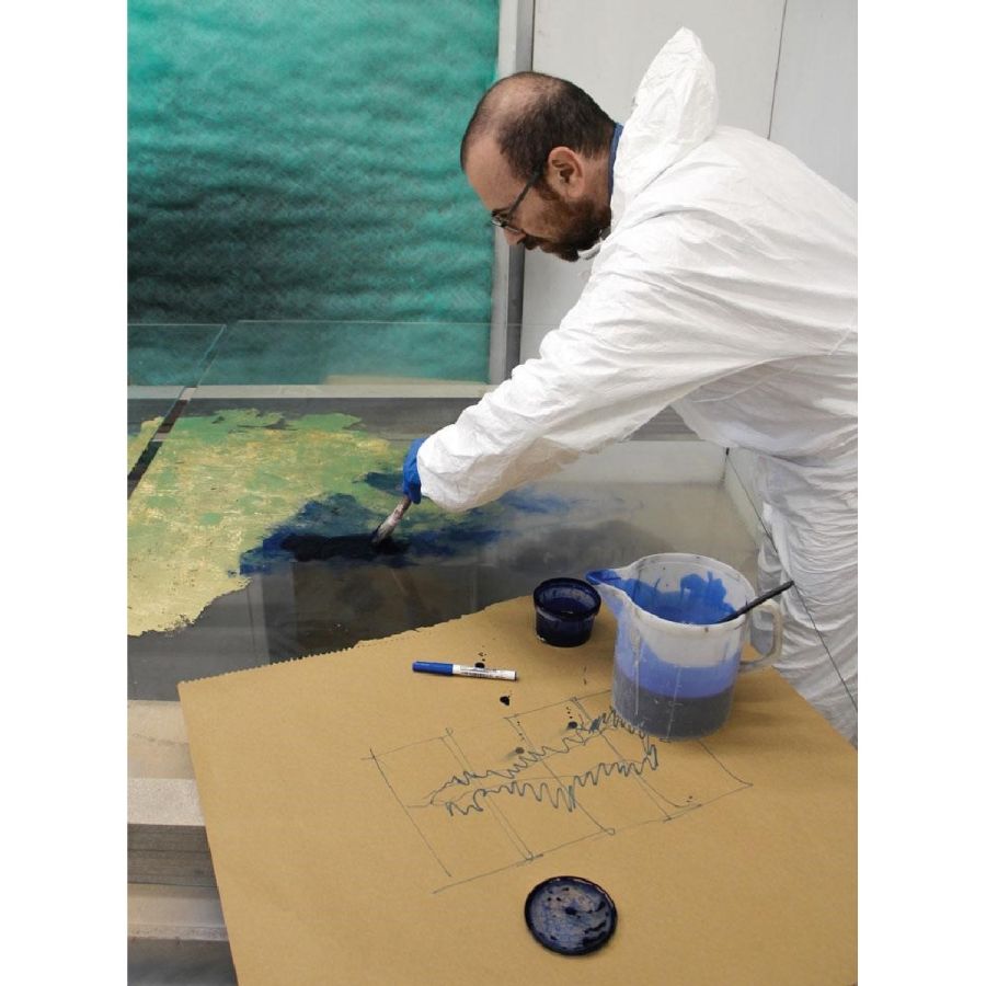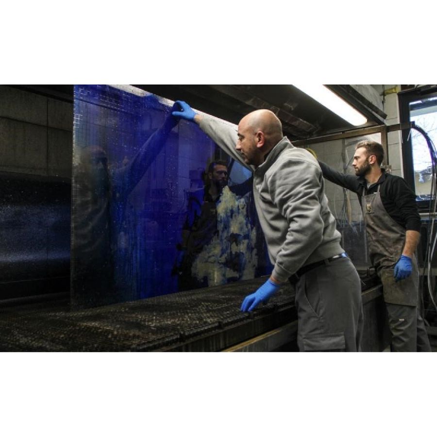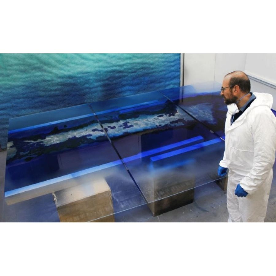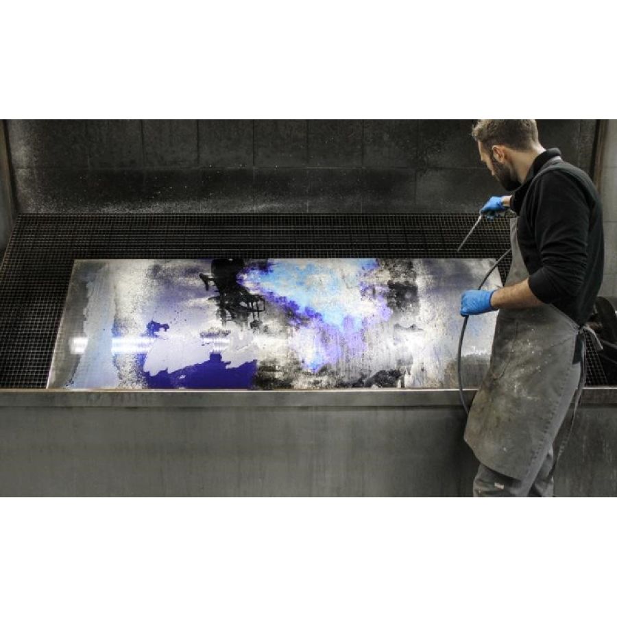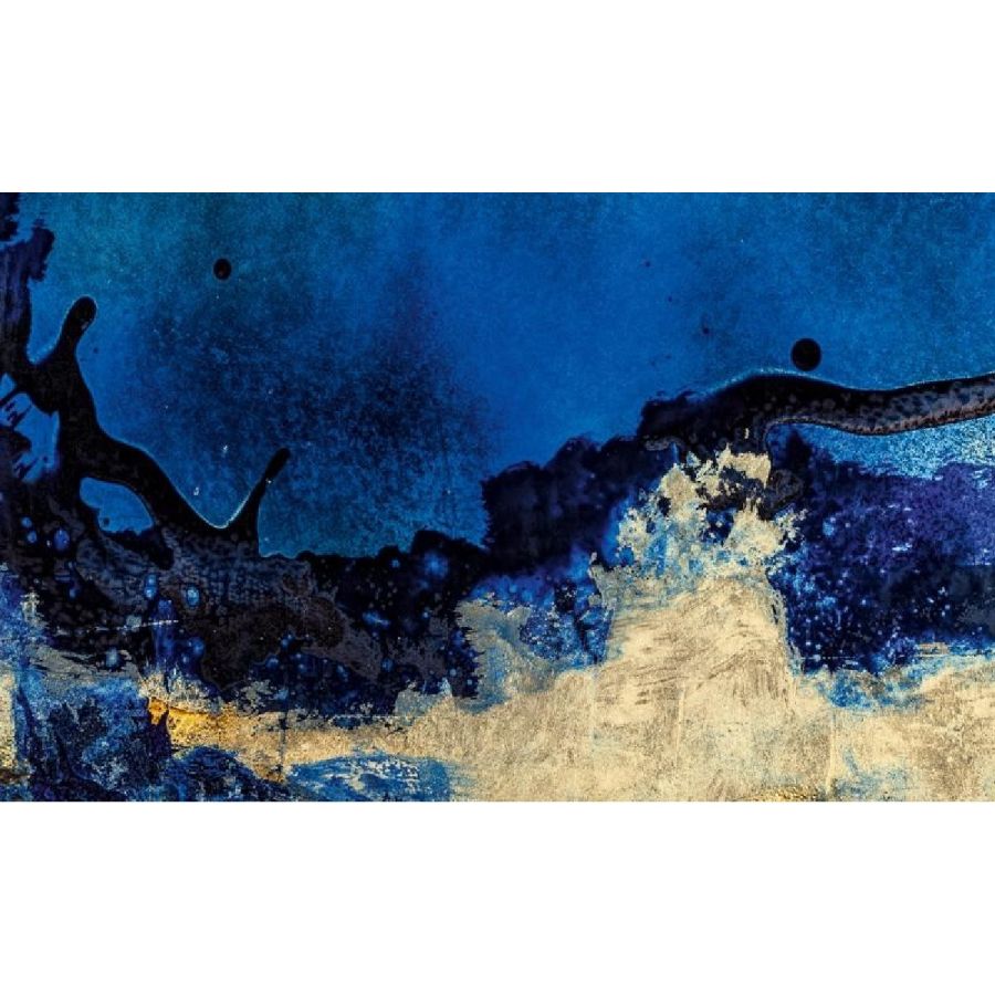 Deep Blue, the artistic finishing made of handmade decorated glass and mirror, introduces new decorative trends for luxury living. Golden leaf meets blue China varnish to give a ravishing and fascinating contemporary glass painting inspired by the blue nuance of Venetian lagoon. Design by Giovanni Luca Ferreri.Four glass panels with gold leafed and scratched decor, with various light-blue and dark-blue varnish hues and with heavy antique mirrored finish.