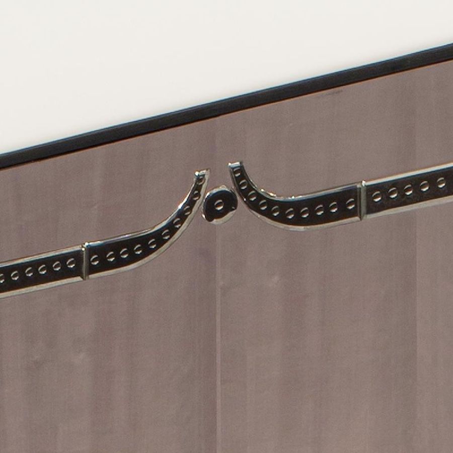 Structure and visible frame made of carbon-black firwood. Central part in shiny grey lacquered tanganica decorated with hand engraved and bevelled mirror set inside the wood.