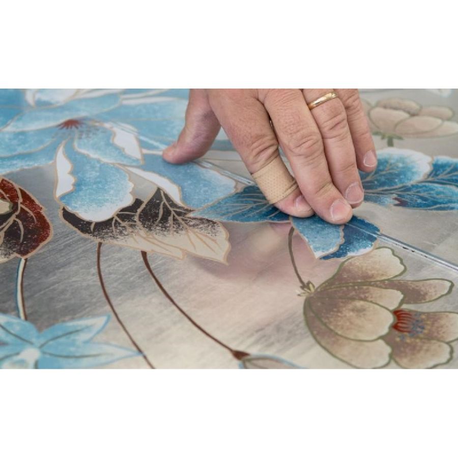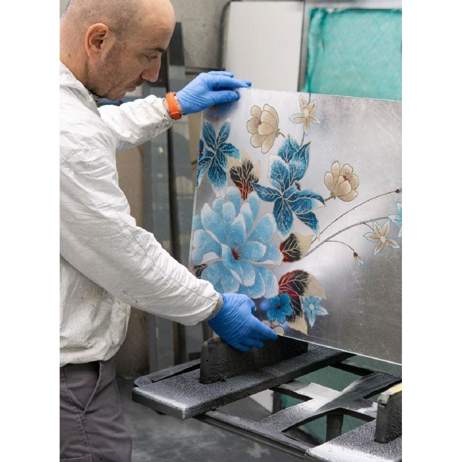 A clearly Japanese-inspired comic, an atmosphere openly oriental with colours painted using the eglomisé technique in shades of blue, forever fixed thanks to the contrast of the application of the silver leaf.