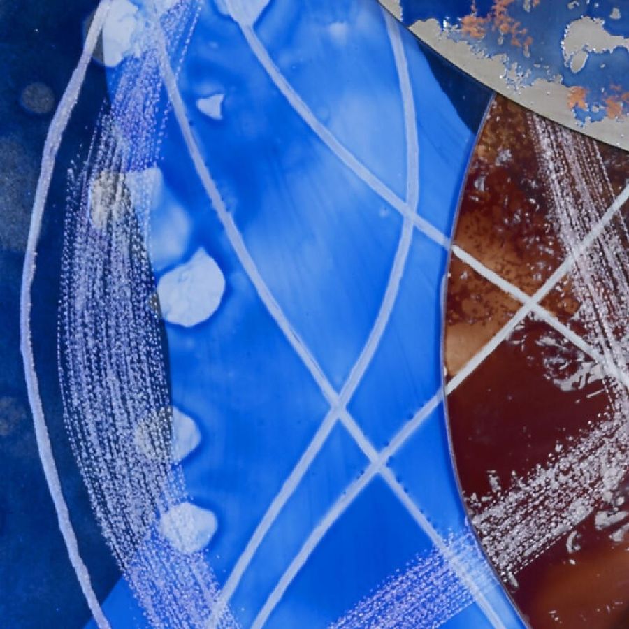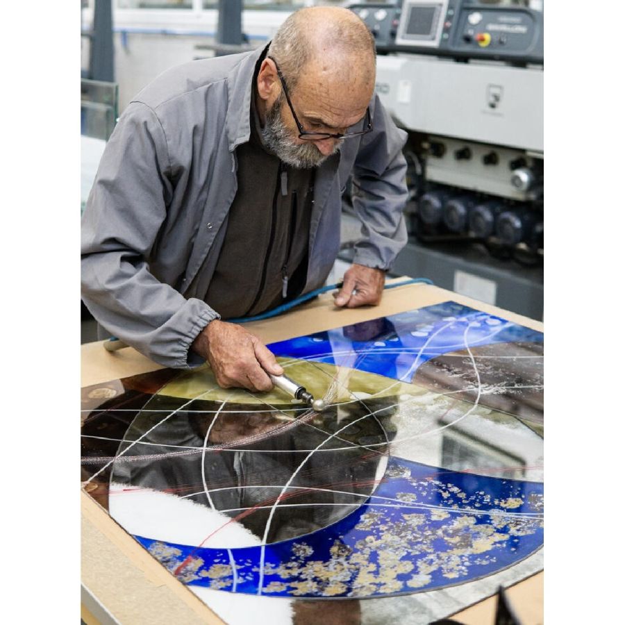 Extra-clear glass panel. Hand-decoration in mixed technique (metal-leaf, engraving and enamel).