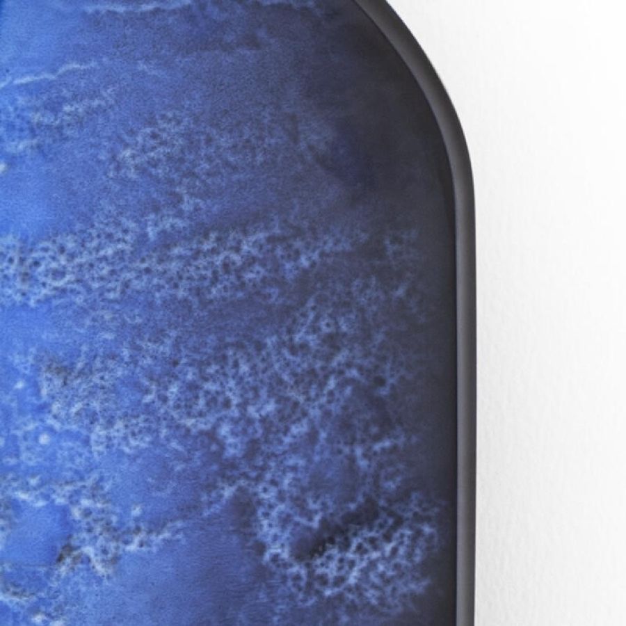 Structure in matt black lacquered wood, recessed. Partially baked, engraved and bevelled glass, decorated with shades of blue and silvered with various levels of antiquing and copper effect.