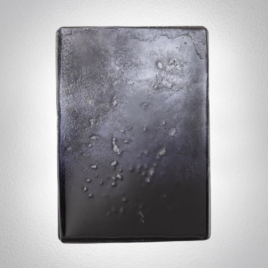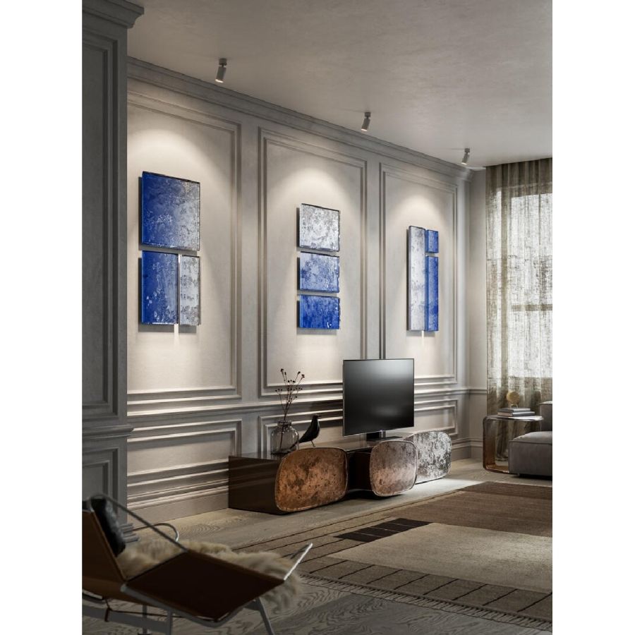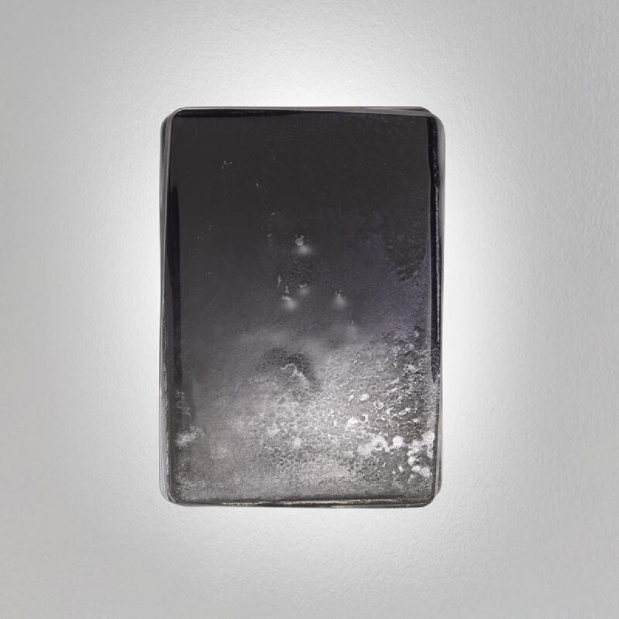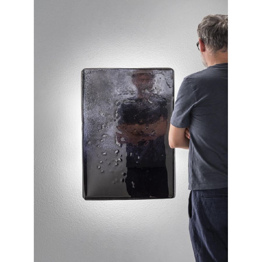 Wall decorations in baked glass in two layers with irregular edges. All decorated degradé from midnight blue to transparent and silvered with medium antique finish. Wooden structure with matt black lacquer finish. LED perimeter lighting.